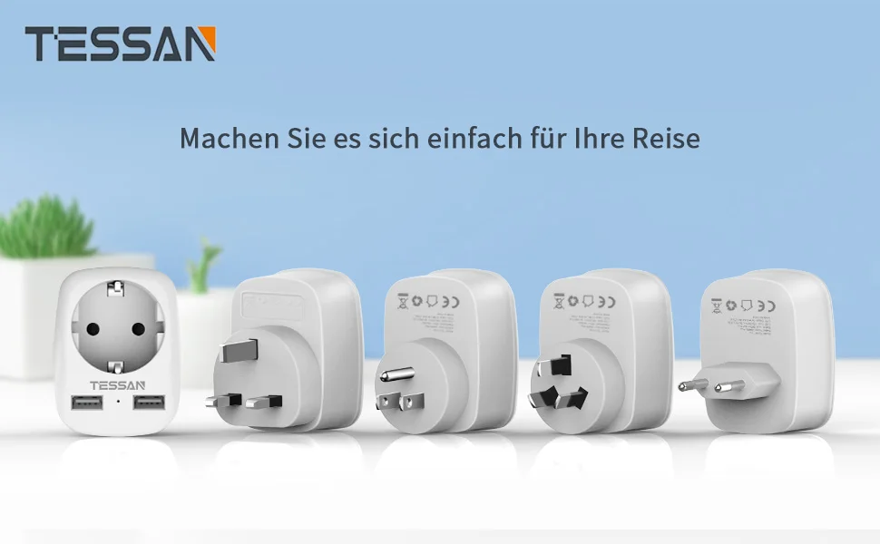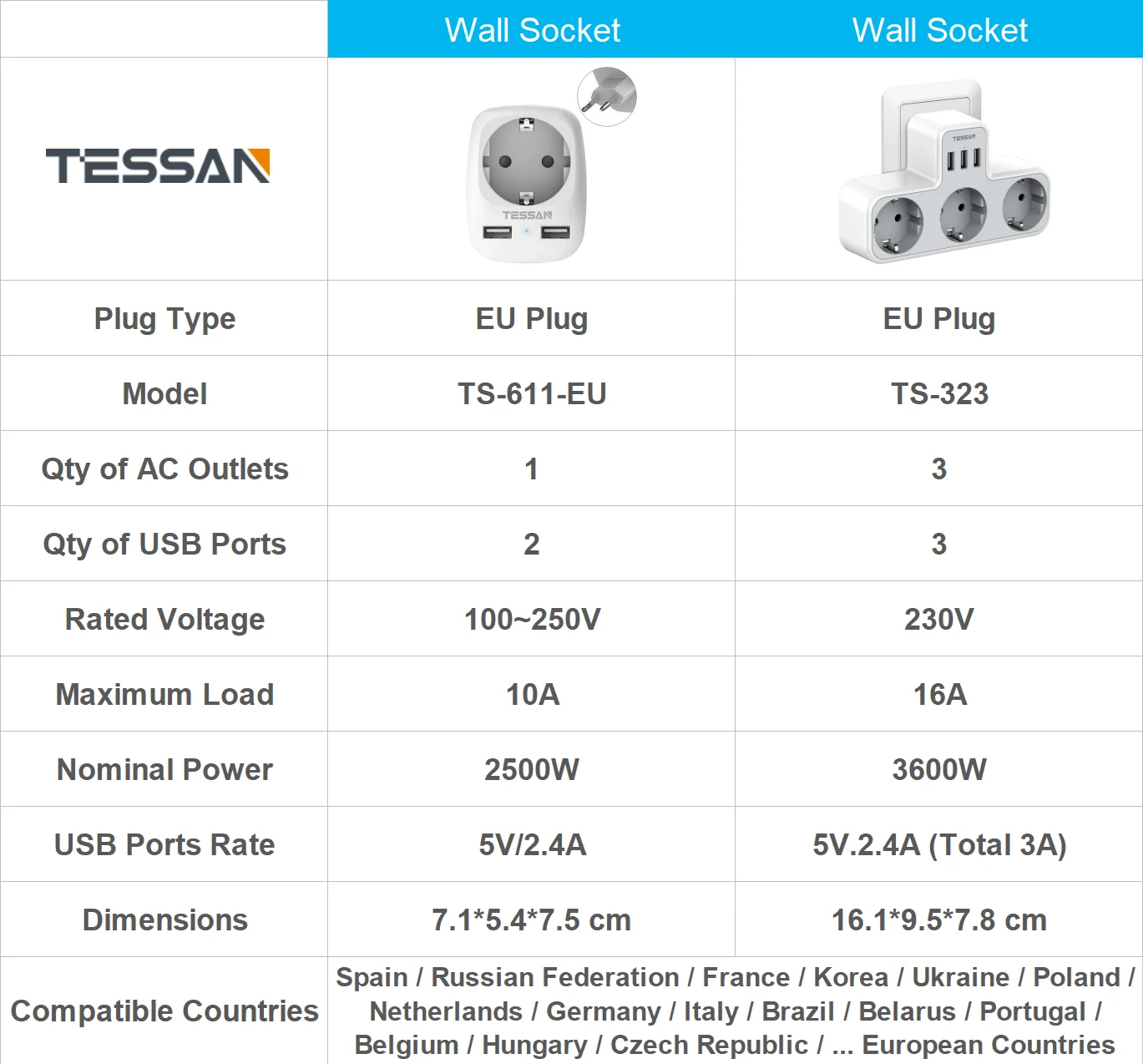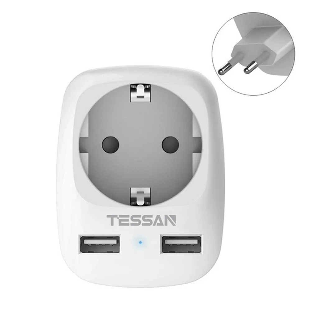 1 Schuko Socket with 2 USB Connections:the TESSAN USB socket adapter is suitable for connection to standard European earthing contact sockets (diameter 4.8mm). Simply plug it into any surface-mounted USB socket and you will receive an extension to 1 Schuko socket and double USB plug to avoid plugging in multiple USB chargers. Multiple socket without cable saves space and keeps your desktop tidy.