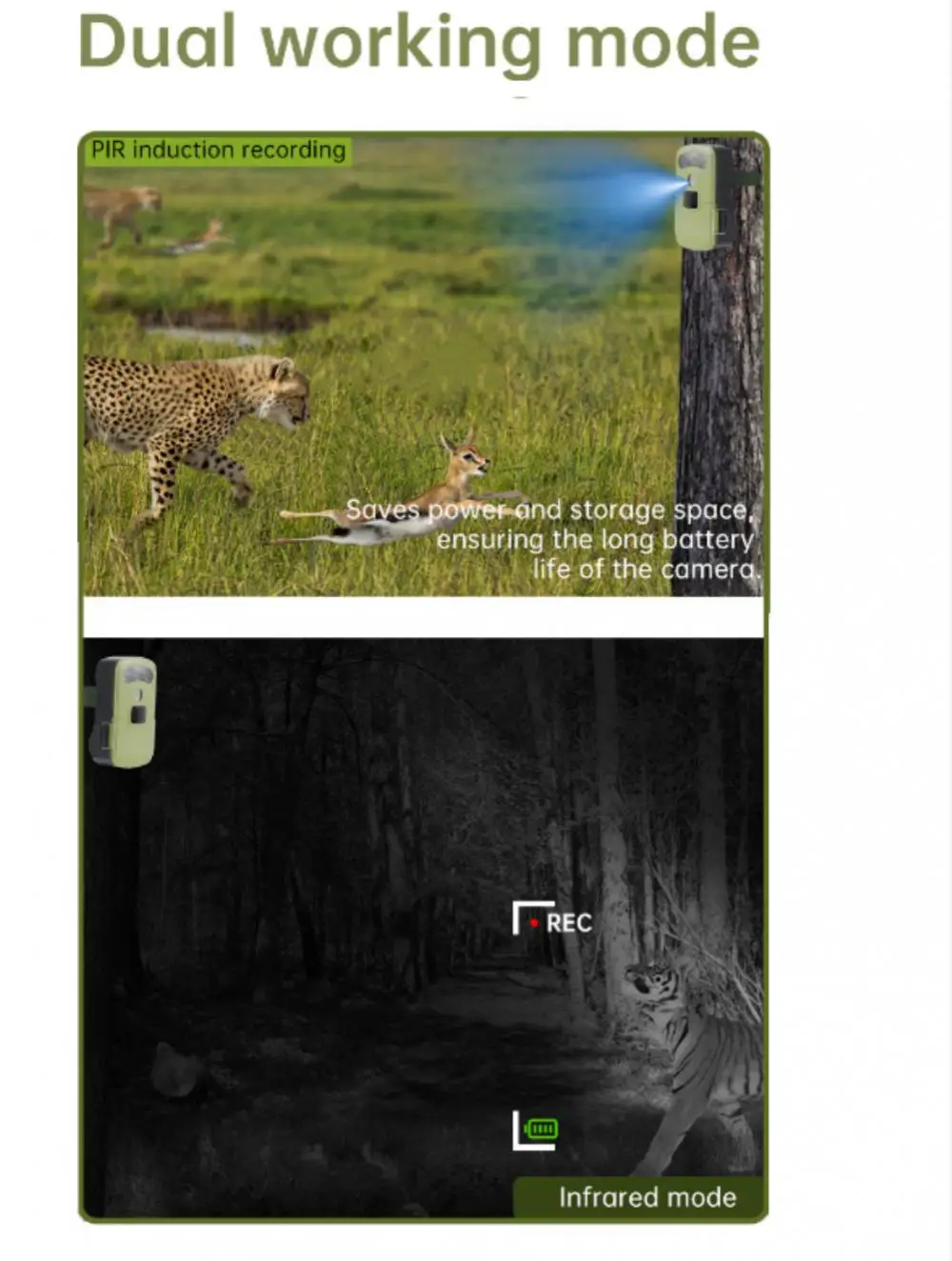 * 1. Двойной режим работы: пироэлектрический инфракрасный датчик движения Запись видео/24 часа непрерывной видеозаписи.