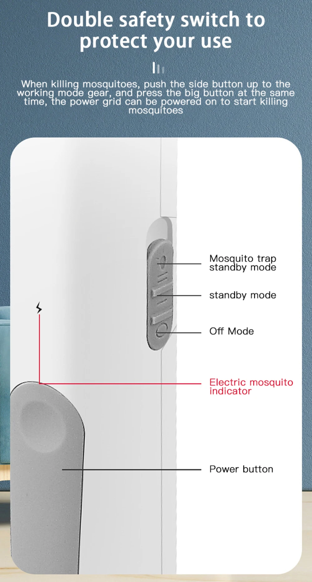 3. Безопасное использование, двойной предохранительный выключатель, ON2: режим работы/ловушки от комаров, ON1: Рабочий режим (необходимо нажать кнопку под индикатором, чтобы насильственно убить комаров), ВЫКЛ: положение выключения