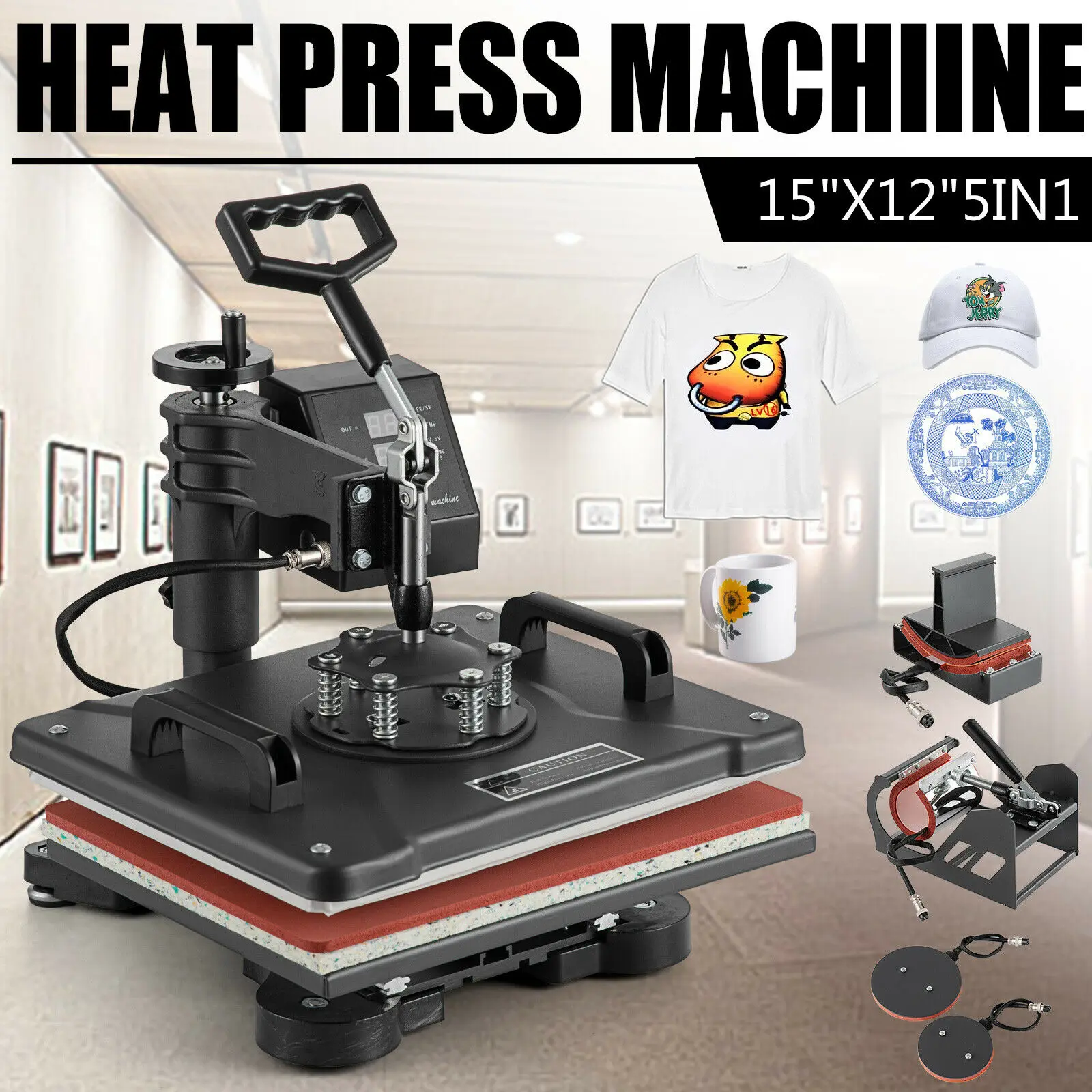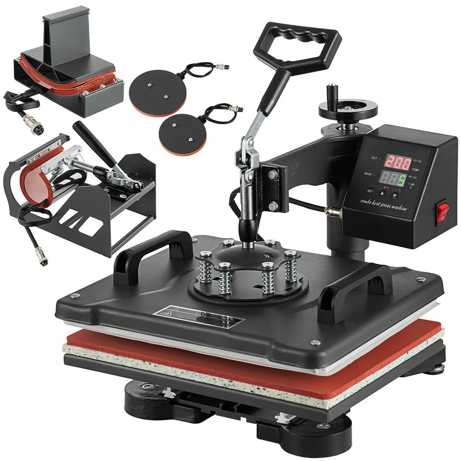 This all-in-one press can be used for T-shirts, caps, ceramic plates, ceramic tiles, mugs, coasters, mouse pads, jigsaw puzzles, lettering, other misc. fabrics & materials.