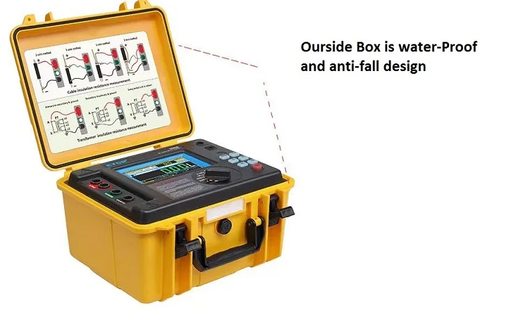 Подходит для тестирования сопротивления изоляции кабеля, двигателя, генератора, трансформатора, взаимного индуктора, высоковольтного выключателя, разрядника и другого большого оборудования.
