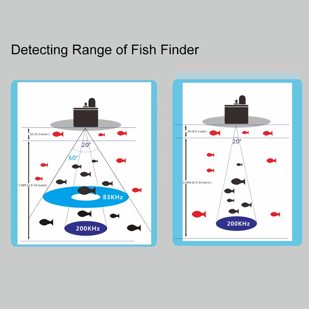 Поддерживает беспроводной Рабочий диапазон 980FT(300m) и обнаружение глубины 590.6FT(180m) с углом луча 45 ° в 200 кГц.
