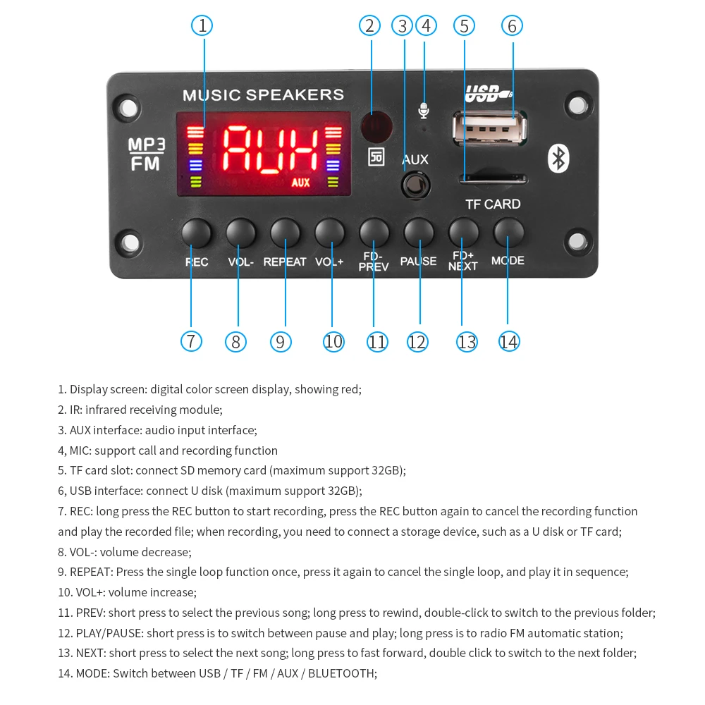 Поддержка функции введения: поддержка MP3 / USB / TF / LINE IN / FM / BLUETOOTH/подключение к пульту дистанционного управления/12 В постоянного тока