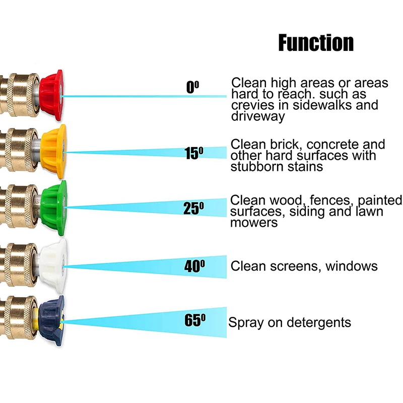 Различные углы, 0 градусов сопло имеет большую мощность давления, подходит для очистки колеса или других зазоров.