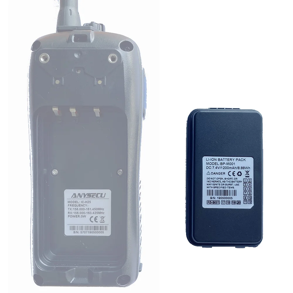 Anysecu Float Walkie Talkie IP67 Waterproof VHF Marine Radio 156.000-161.450MHz 5W Ham Radio Station IC-H25 Voltage: 7.4V Capacity: 1200 mAh Battery Type: Li-ion 100% New And Original Battery Pack for IC-H25 Portable Radio