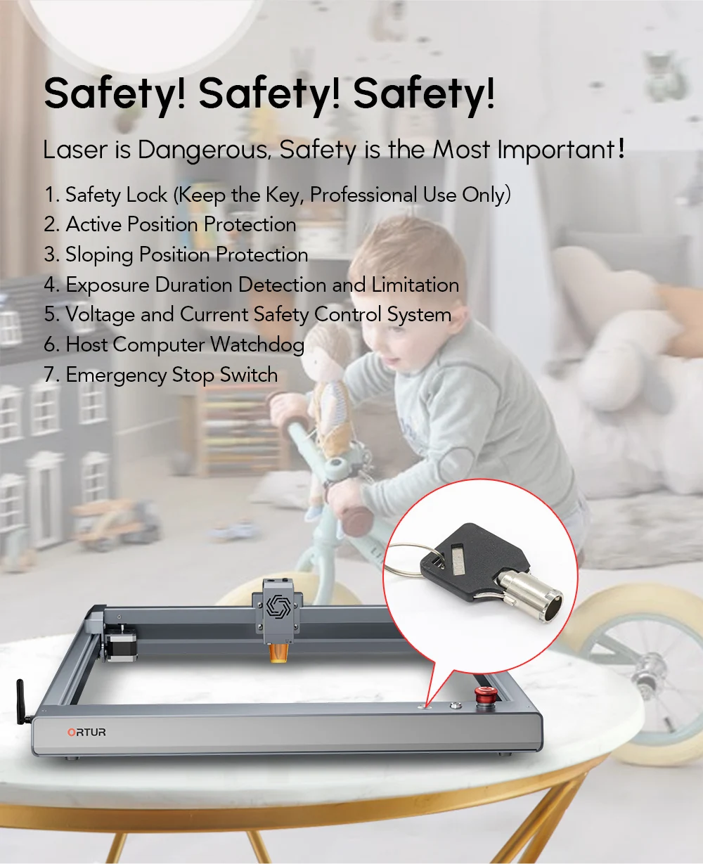 ►Каковы преимущества лазерного мастера ORTUR 3 лазерного гравера?7 система защиты безопасности S: замок безопасности (только для профессионального использования), защита активного положения, защита наклонного положения, обнаружение и ограничение продолжительности экспозиции, система контроля напряжения и тока, хост компьютер сторожевой, аварийный выключатель.