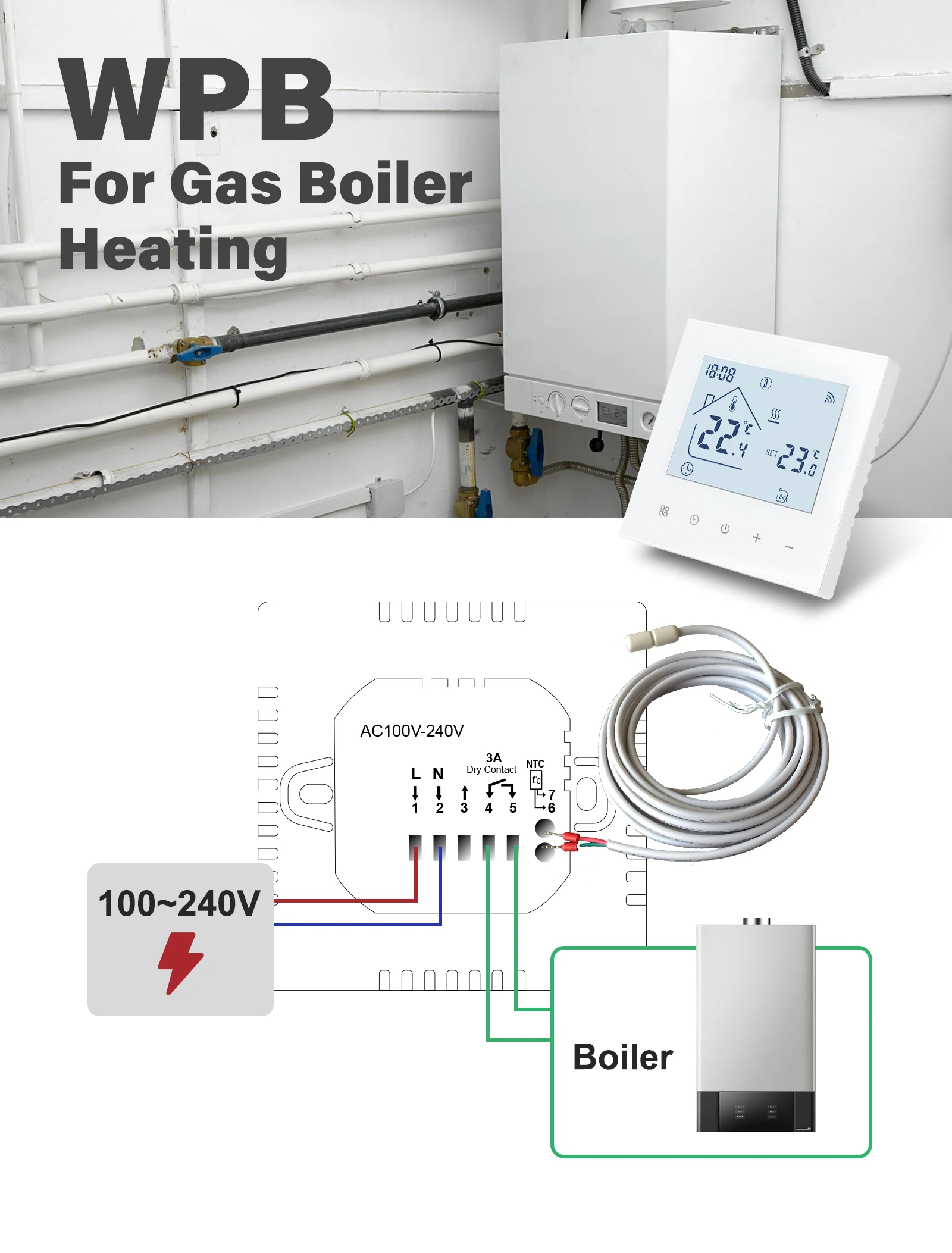 1. Простота в использовании: Термостат смывной, Монтажная коробка: 86x86 мм квадратная или европейская 60 мм круглая коробка, Макс. ± 0,5 °C точность создает температуру может быть контролировать в пределах 1 ℃, сделает вашего ребенка более комфортным. 2. Три режима работы: Программируемый режим, ручной режим и временный ручной режим. Когда вы выбираете временный ручной режим, вы можете вручную настроить температуру на этот период времени в режиме программирования, так что вы можете выбрать режим, наиболее подходящий для вашего образа жизни. 3. Три режима датчика: Внешний напольный датчик, внутренний датчик воздуха, контроль воздуха и ограничение пола. Вы можете настроить температуру комнаты вручную, когда продукт работает в соответствии с режимом программирования, и термостат будет продолжать работать в соответствии с режимом программирования, когда наступает следующий период времени. 4. Разница: Режим EP: для электрического подогрева пола, 16A, макс. 3600 Вт. Используется для управления нагревательным кабелем, нагревательной пленкой. И т. д. Режим WP: для водяного напольного отопления, 3A, он используется для управления нормально закрытыми (NC)/нормально opend (NO) электротермальными приводами, клапанами. И т. д. Режим WPB: для газового котла отопления, 3A, он используется для управления котлами или катушками, которые подключены через сухое соединение. 5. Функция отключения памяти: Программирование и настройки остаются после включения питания. Вам не нужно сбросить его.