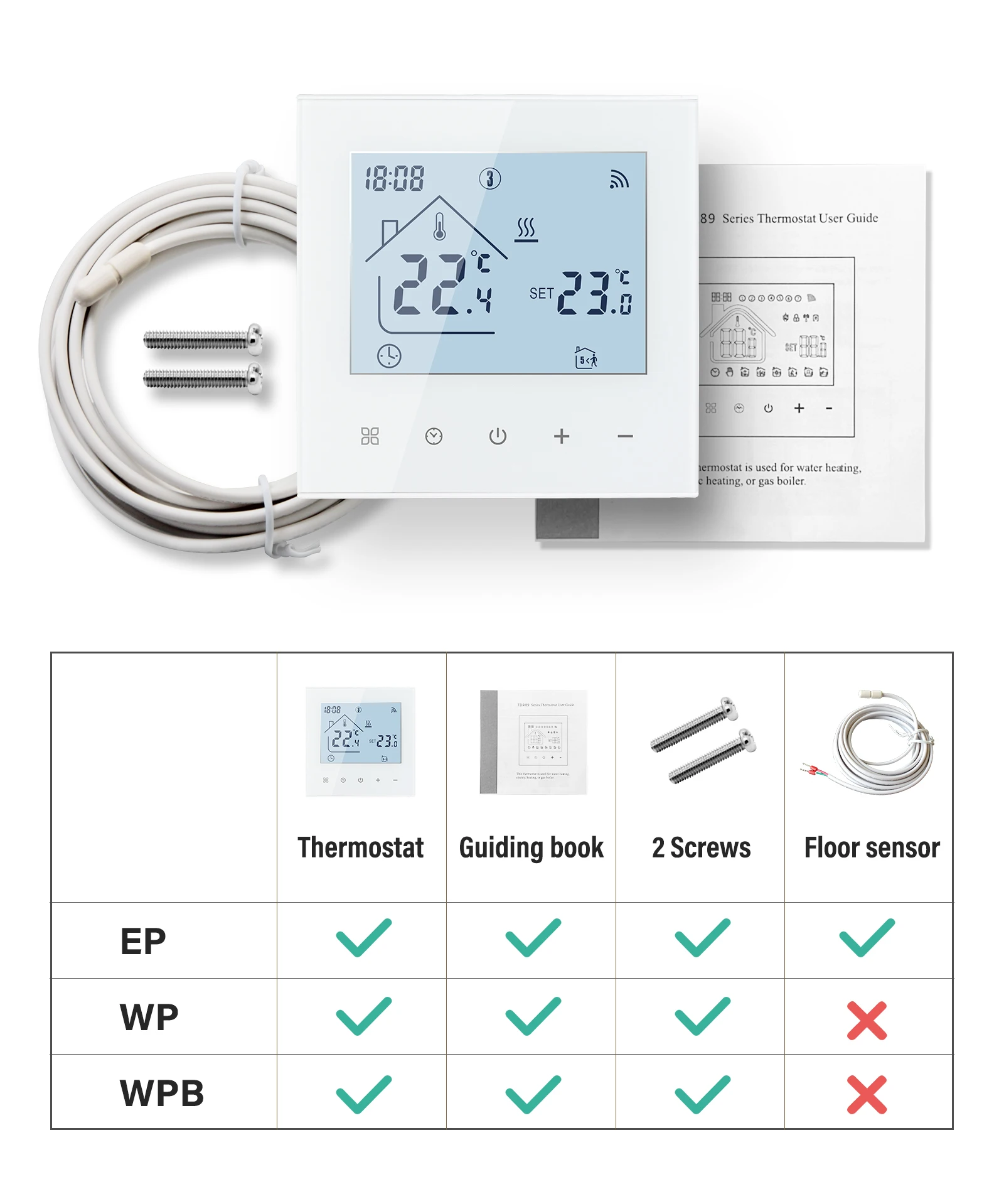 Термостат * 1 Руководство пользователя * 1 Винты * 2 Напольный датчик * 1 (только в режиме EP)