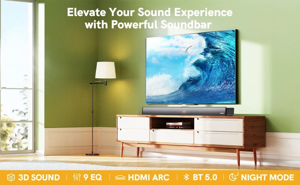 Этот саундбар имеет превосходный звук эквалайзера, чтобы обогатить ваши видео и слушать ваш телевизор лучше сразу. Звуковая панель cinematic TV с реалистичным звуком, таким как фильмы, игры, музыка, новости, бас, 3D, HiFi и режим динамического эквалайзера. Графический эквалайзер помогает регулировать эмоции звука и добавить басы для большей глубины, что обеспечивает более высокую производительность окружающего звучания.