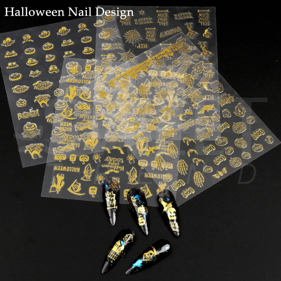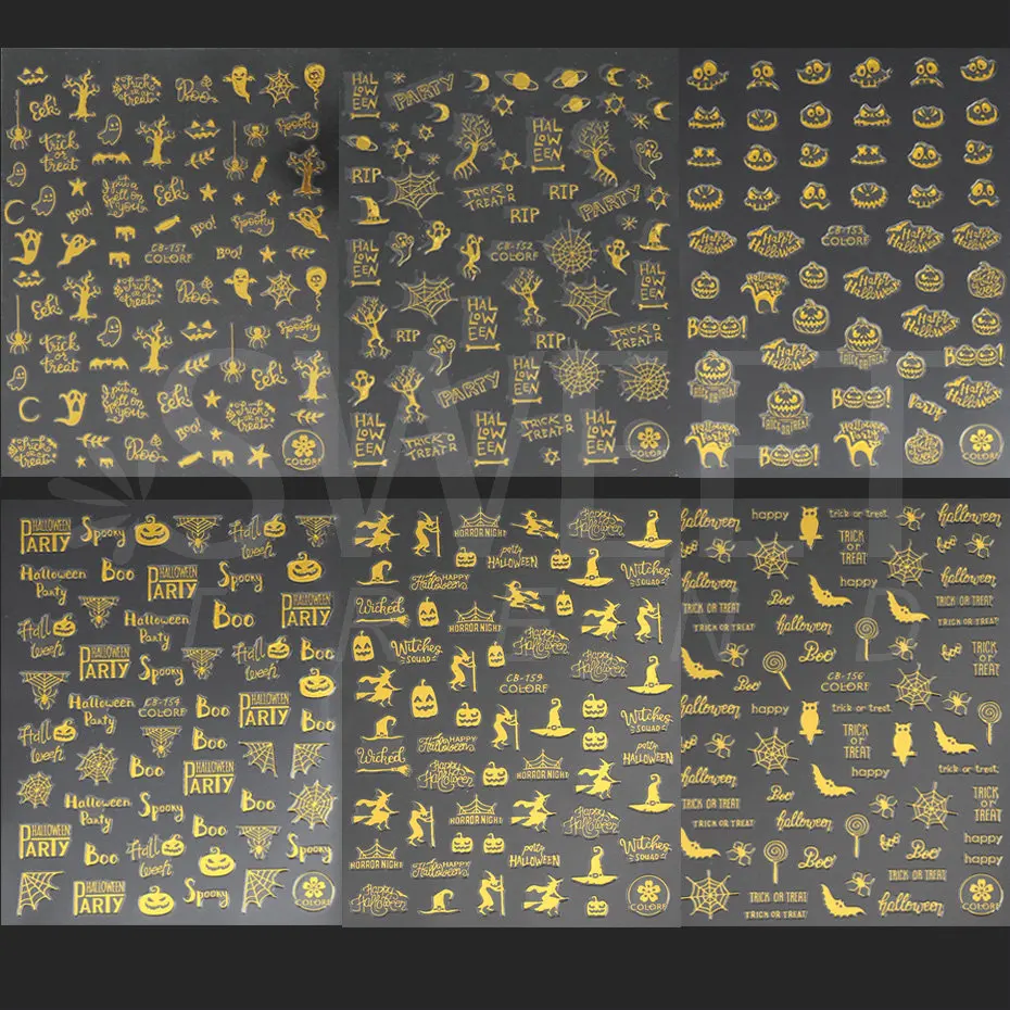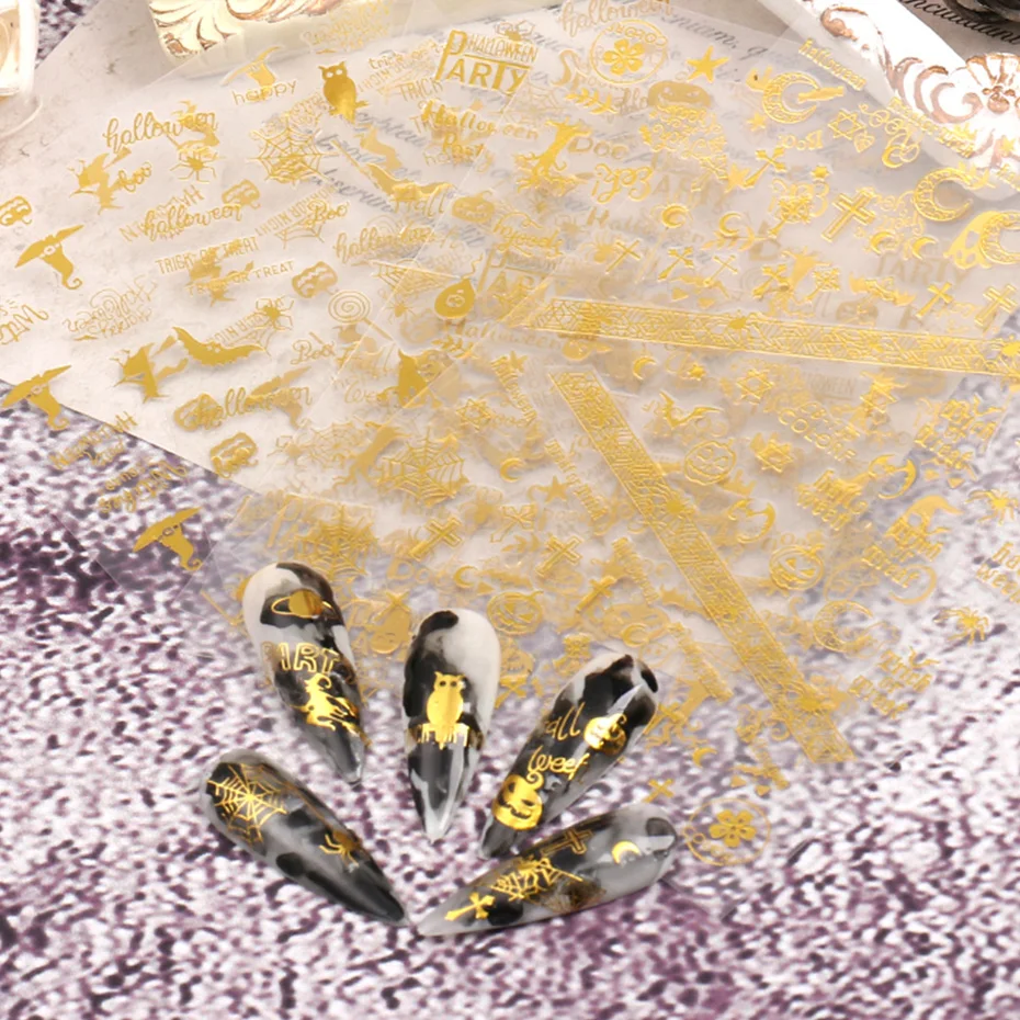 Набор золотых наклеек для ногтей на Хэллоуин, 9 шт., голографическая 3D наклейка, тыква, ведьма, летучая мышь, паук, слайдер, зима, сделай сам, украшение для ногтей, BECB151-159