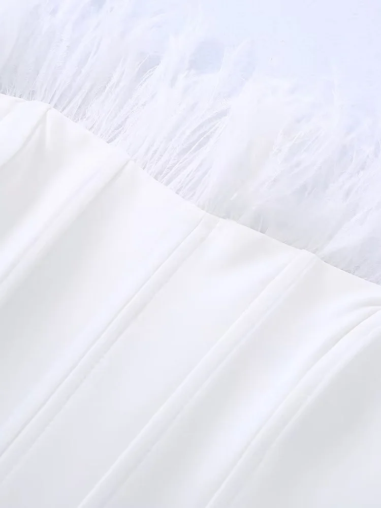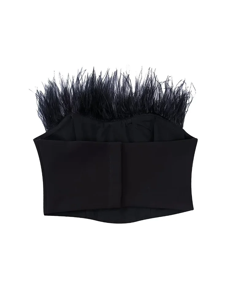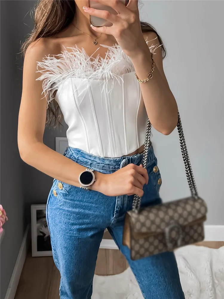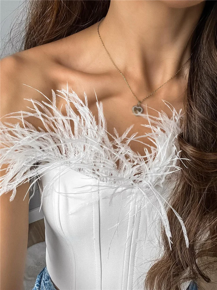 Женские элегантные облегающие Топы без бретелек с перьями в стиле пэчворк 2022, шикарные женские укороченные вечерние топы с открытой спиной, женские модные однотонные майки