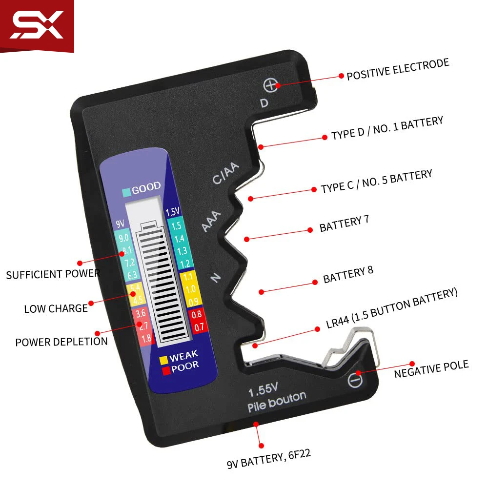 Подходит для таких аккумуляторов, как AA, AAA, C, D, 9 В, 6F22 и 1,55 в кнопочный элемент (не для 3 В), а не для аккумуляторной батареи.
