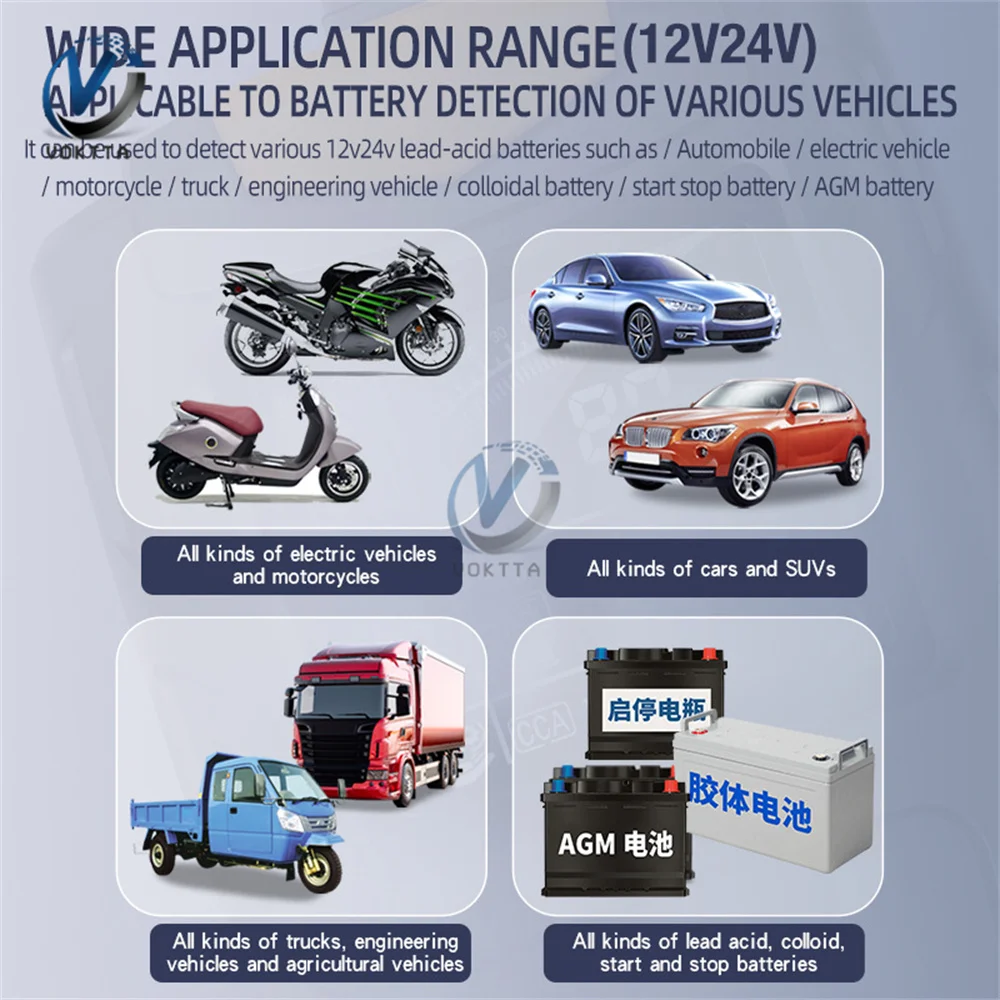 7. Широкий спектр применения (12V24V) используется для/автомобиль/электромобиль/мотоцикл/грузовик/инженерное транспортное средство/коллоидный аккумулятор пусковой батареи/AGM батарея/и другие типы 12V24V свинцово-кислотных батарей обнаружения
