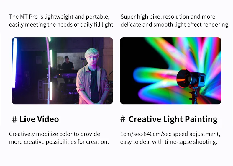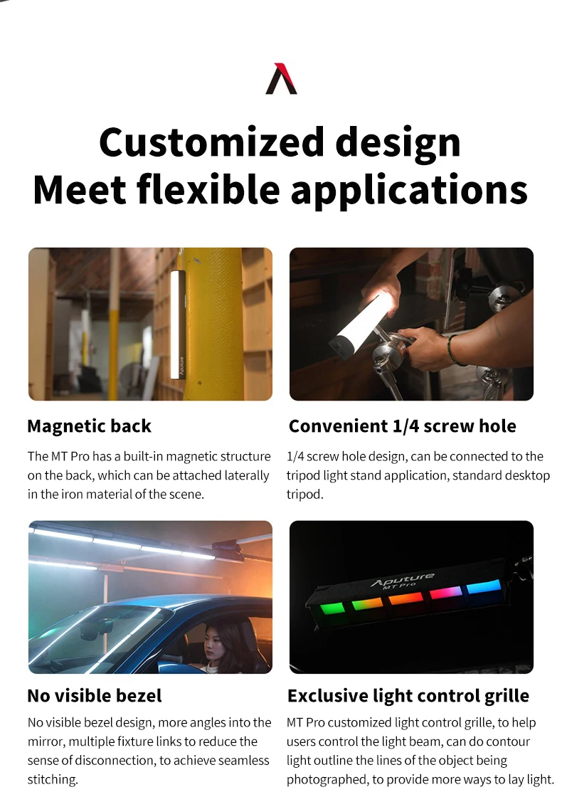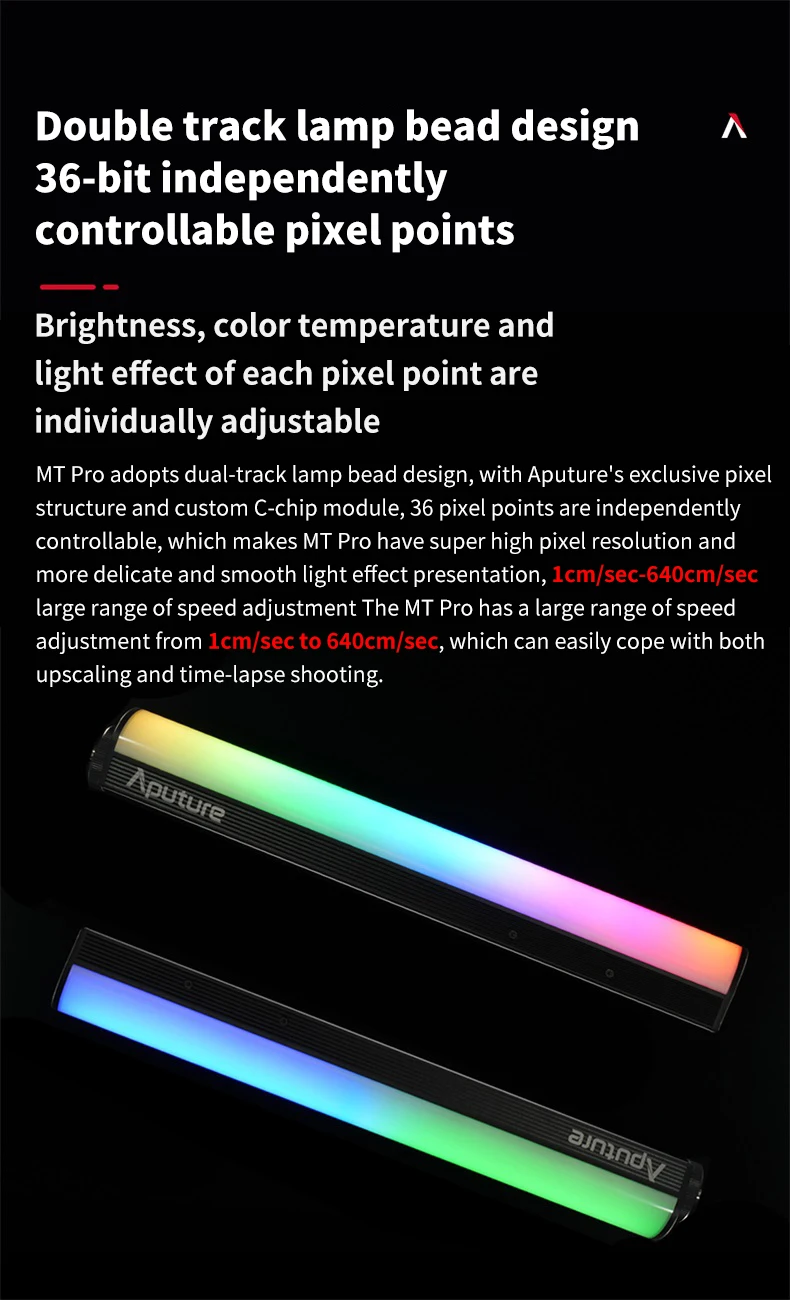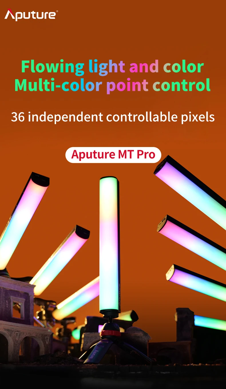1. MT Pro-это первый полноцветный мини-светодиодный светильник Aputure. Как часть мини-серии, MT Pro светит как приспособление, которое может поместиться в компактные пространства с профессиональным CRMX подключением и непревзойденным контролем пикселей.