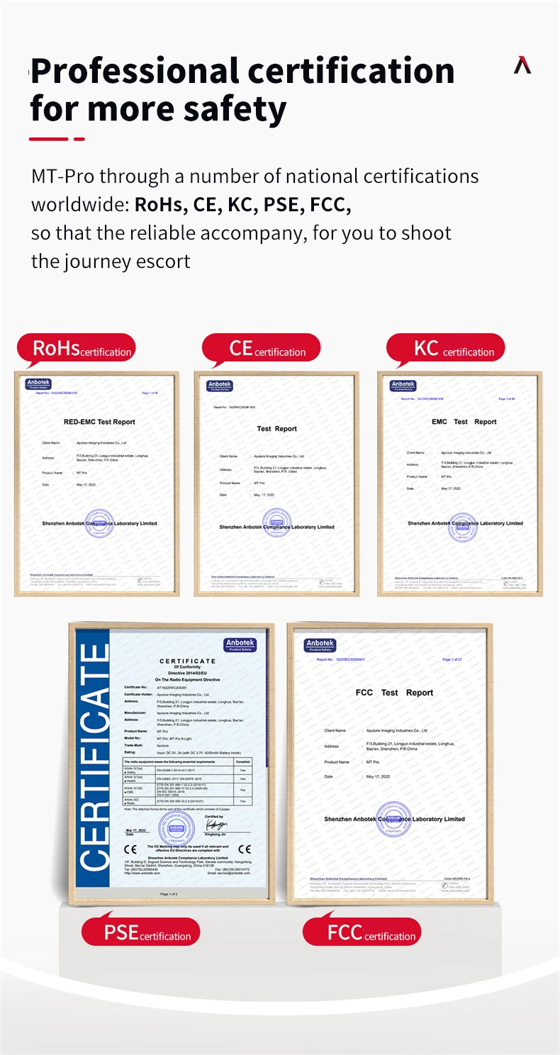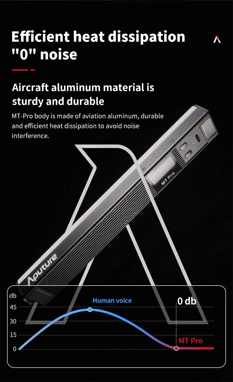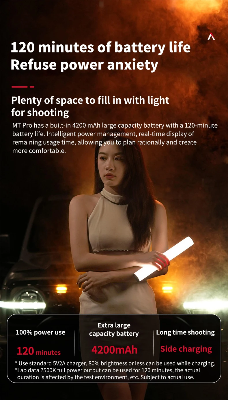 6. Прочная конструкция MT Pro также имеет высокий стандарт Aputure для качества сборки, с его легким алюминиевым корпусом 391g, И встроенным разъемом спецификации USB Type-C перезаряжаемый аккумулятор, который может работать на MT Pro на 7,5 Вт Максимальная выходная мощность для 120 минут.
