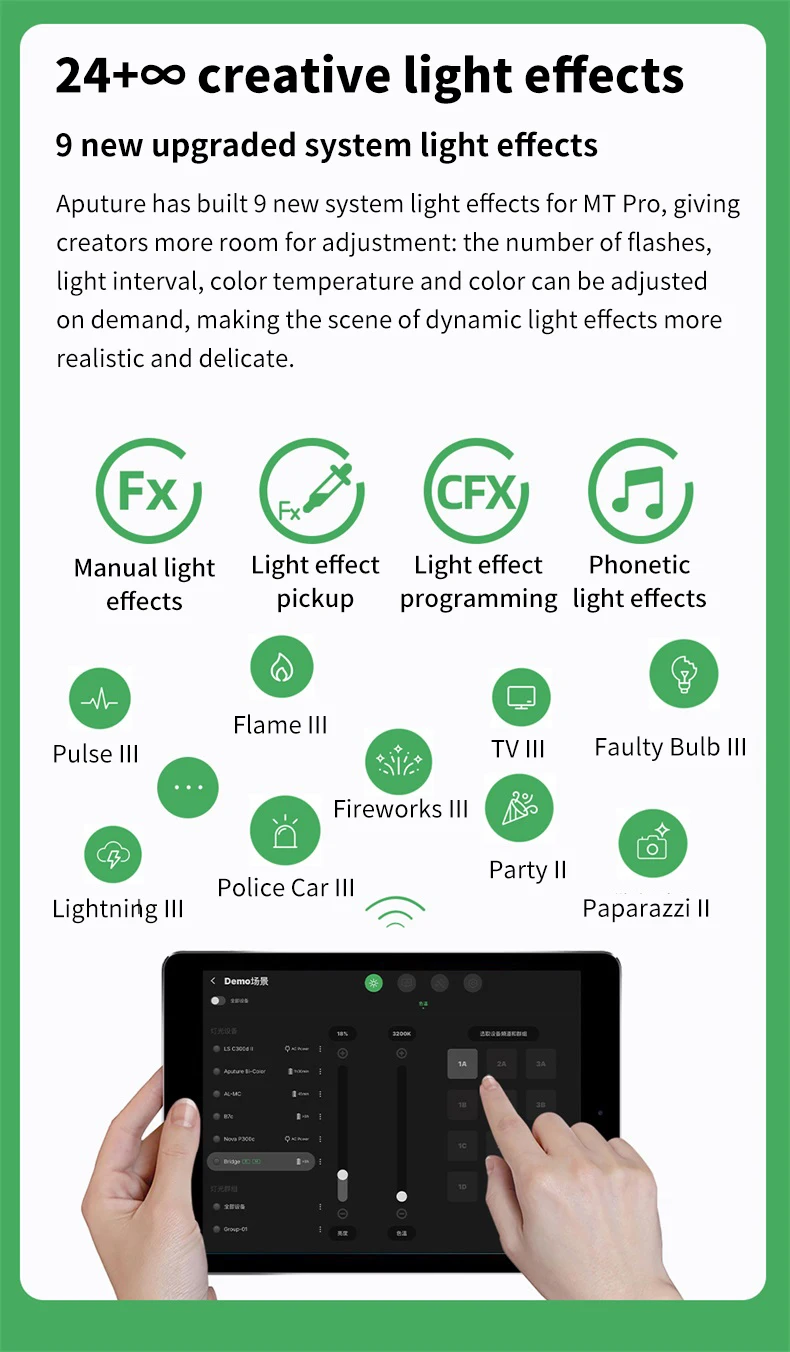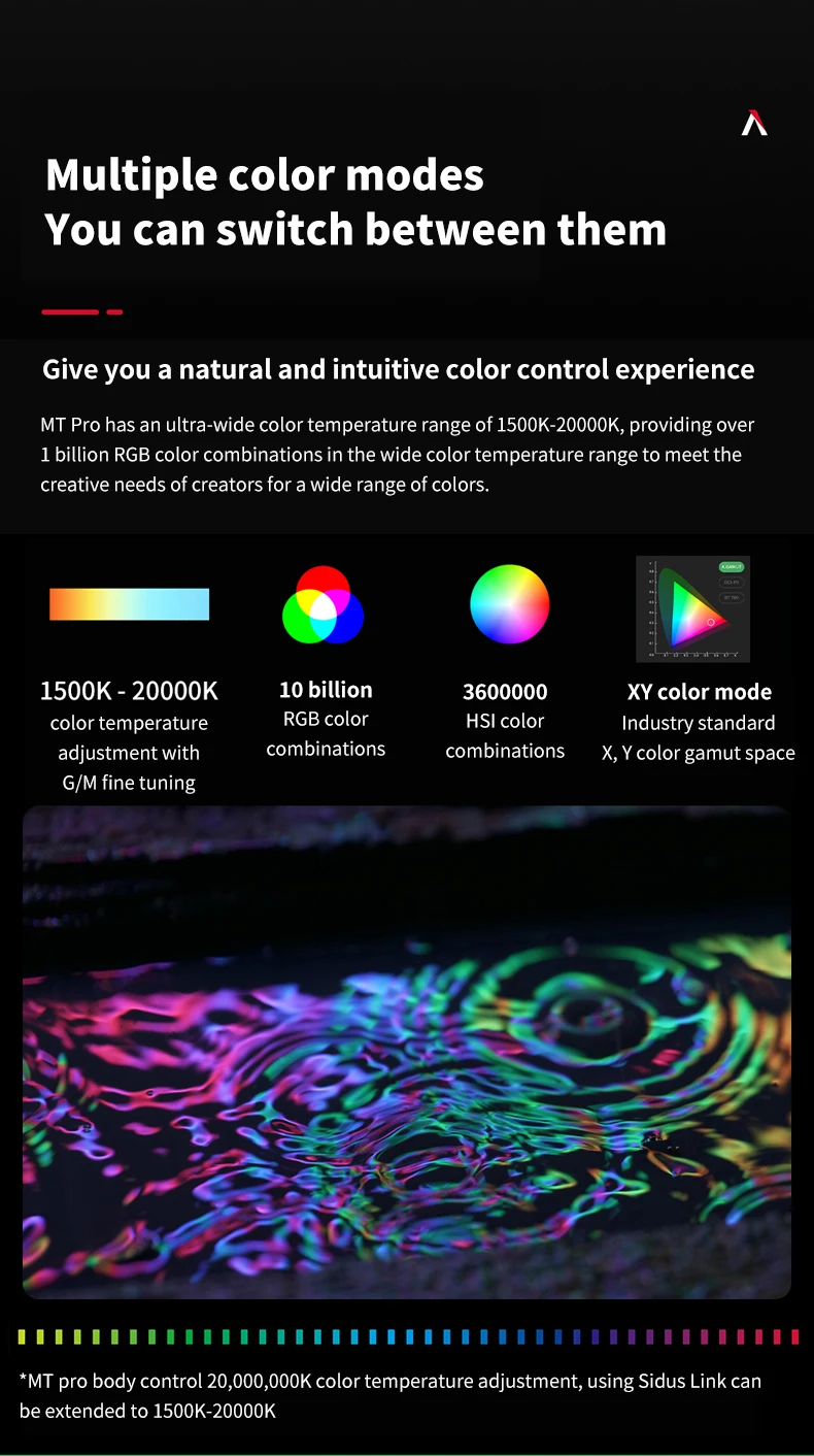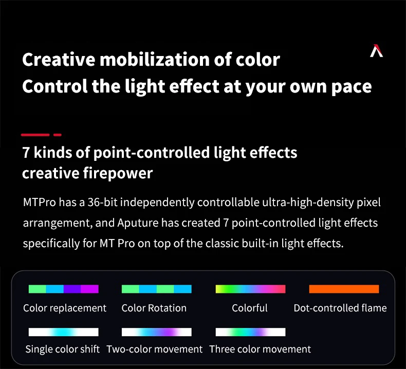 5. Помимо 9 систем FX и 7 пикселей FX, MT Pro оснащен другими передовыми функциями, уникальными для Aputure и amaran eco System s, такие как Picker FX и Custom FX, которые могут храниться с помощью приложения Sidus Link для легкого доступа к различным режимам светильник. Для полной творческой свободы, он также имеет критическое цветовое управление (включая Расширенный HSI с регулировкой белого точки, xy и RGB) и профессиональные варианты, такие как LumenRadio CRMX для беспроводного управления DMX и RDM *.