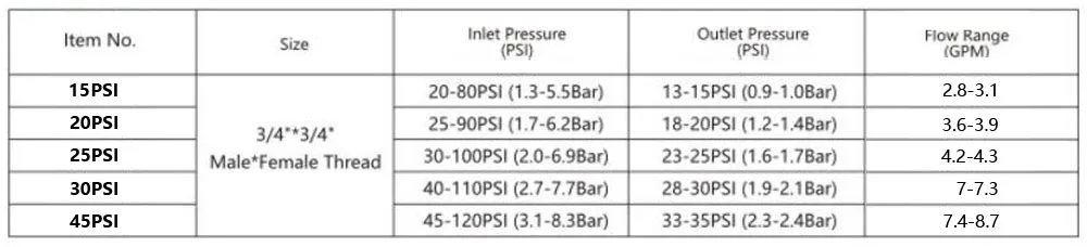 Диапазон регулировки давления: 20 ~ 100 фунтов на квадратный дюйм, максимальное давление на входе воды: 120 фунтов на квадратный дюйм, клапан регулирования давления поток: 2 ~ 9 GMP