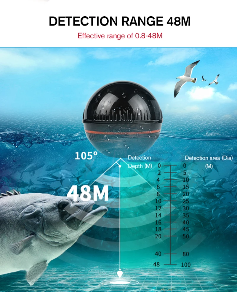 Bluetooth is connected to the mobile phone wirelessly, and the 125 kHz sonar frequency works in the range of-10 ~ 60℃. It can explore the fish in the range of 105 below, which is easy to use.