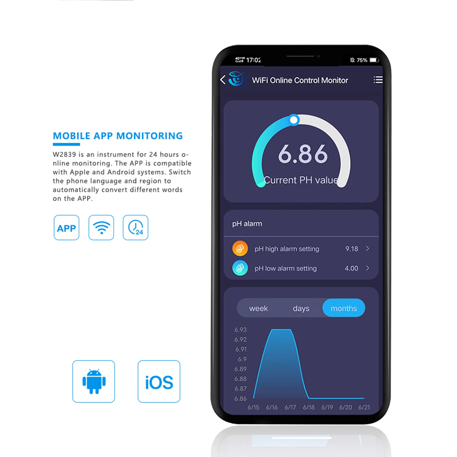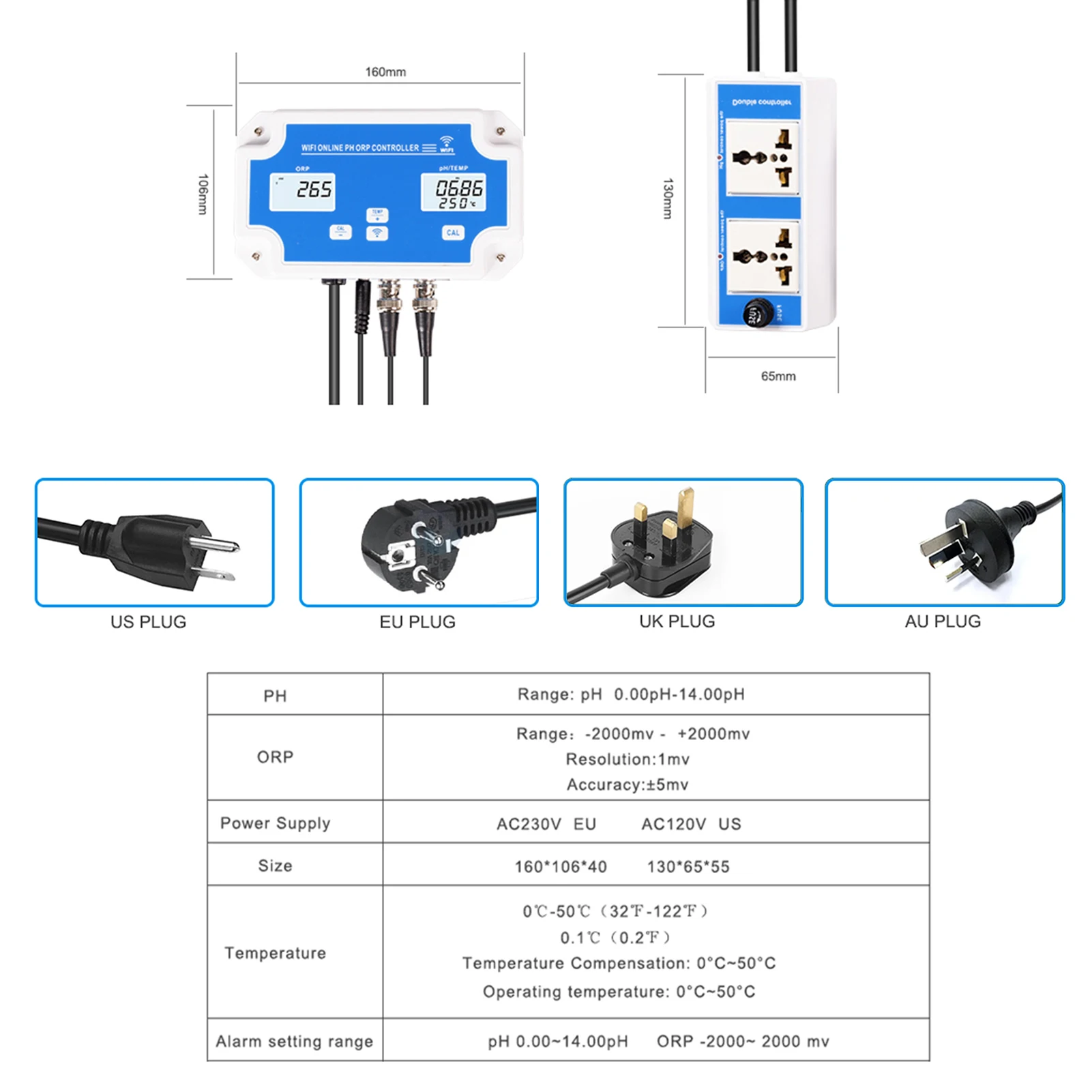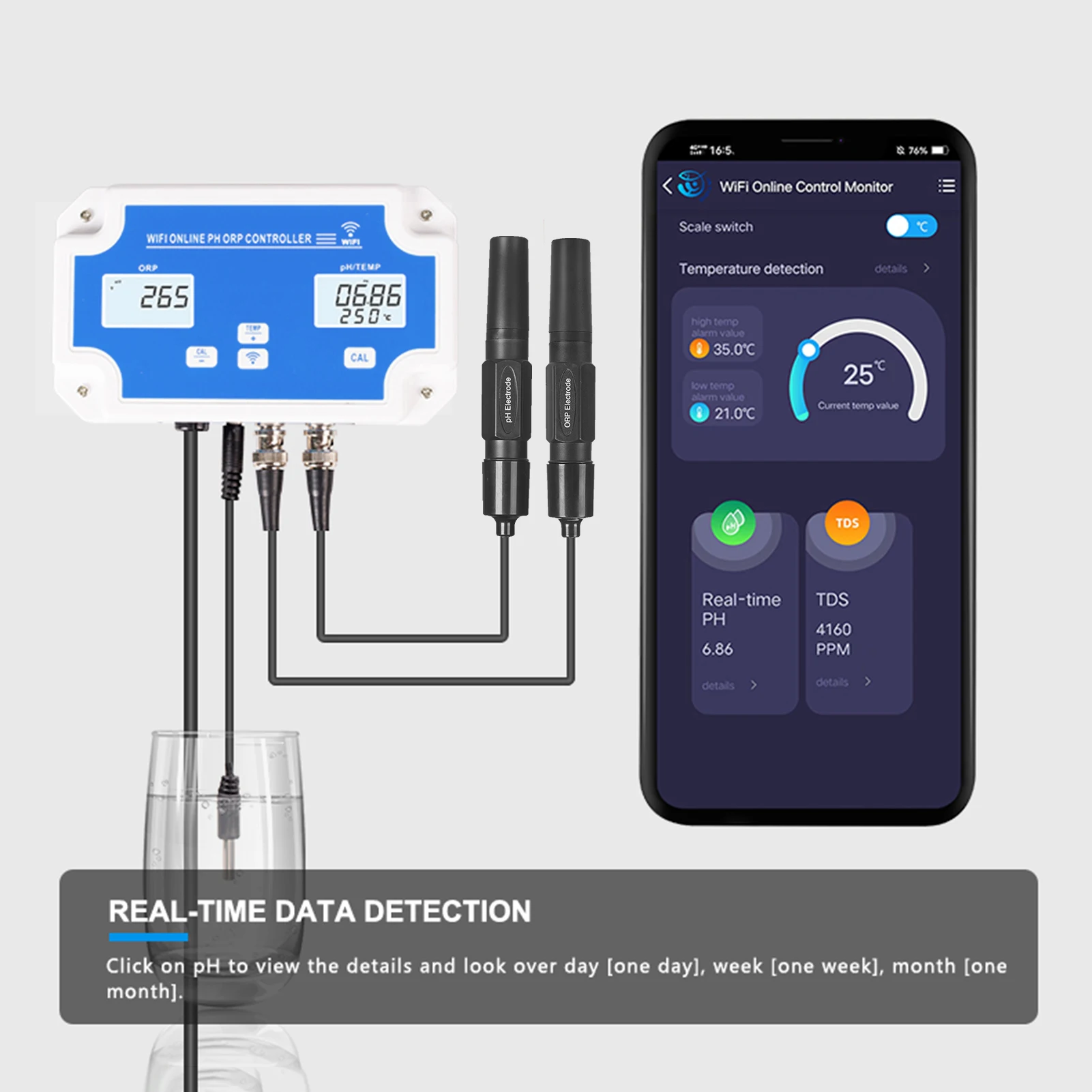 Онлайн-Контроллер pH ORP WiFi позволяет в режиме реального времени контролировать pH и ORP через смартфон в приложении Tuya (бесплатно), Он совместим с ios и системой Android, идеально подходит для 24 часов онлайн-мониторинга.