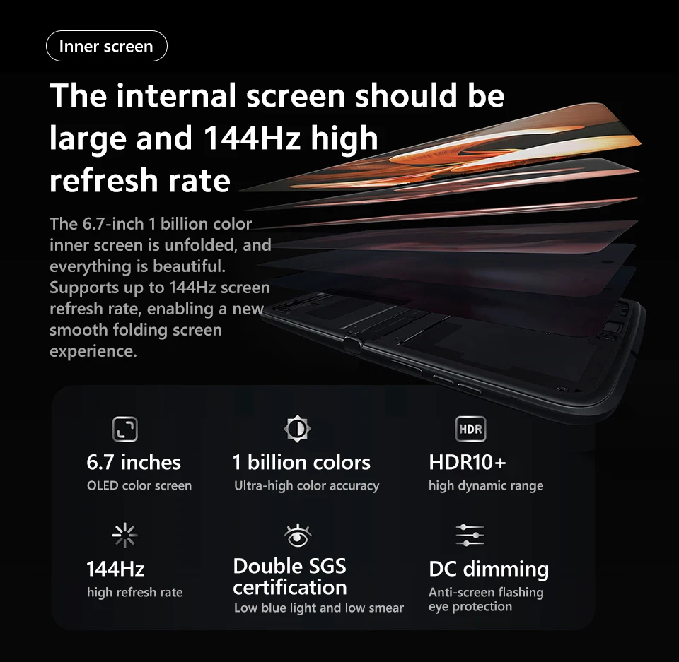 6,7 дюйма 1 млрд цветная внутренняя экран раскладывается, и все красиво. Поддерживает скорость обновления экрана до 144 Гц, что обеспечивает Новый Гладкий складной экран.