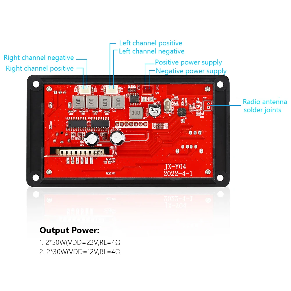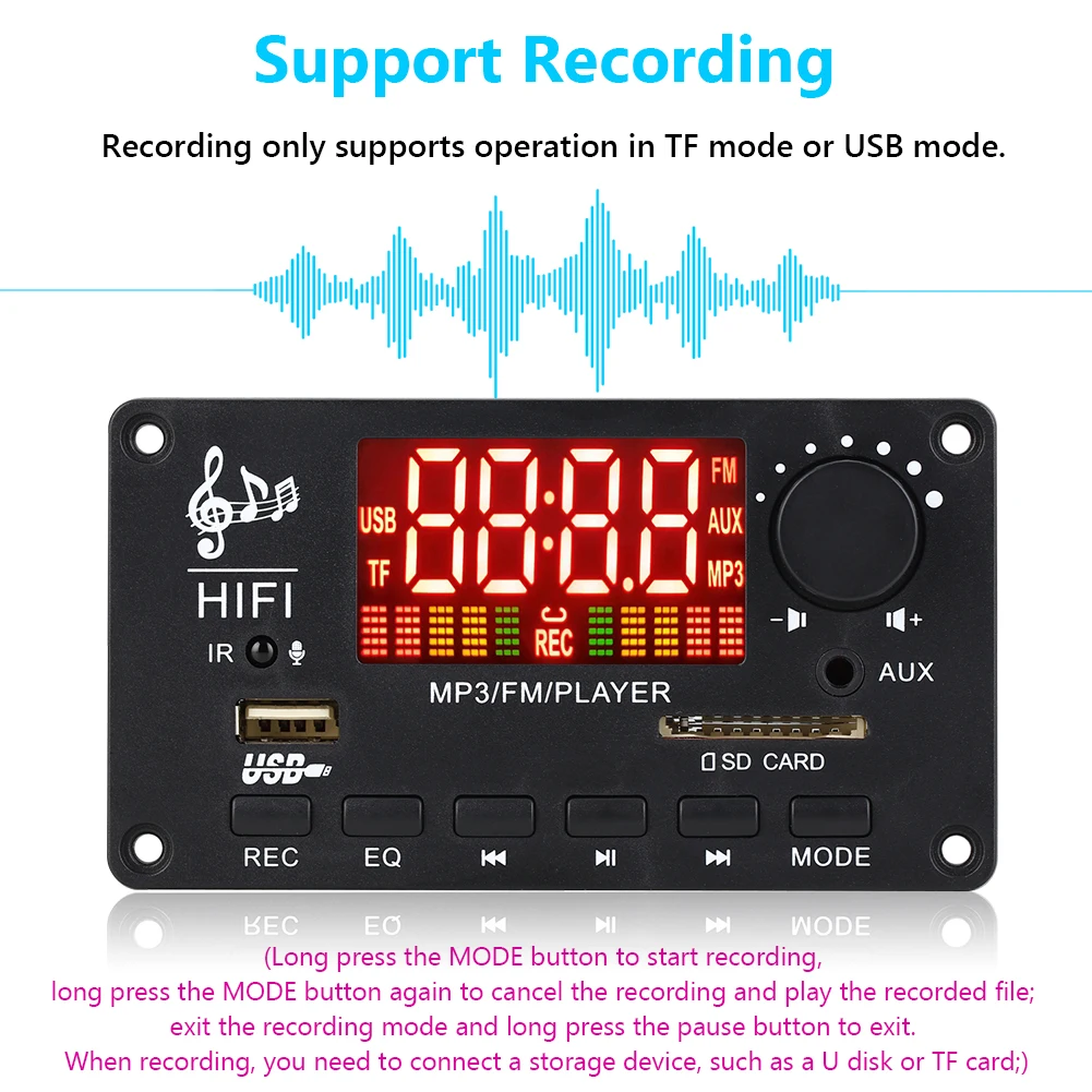 1. Функция:Совместимость с Bluetooth версии 5,0. Поддержка вызова (нажмите кнопку паузы, чтобы ответить на вызов при входящем вызове). Запись поддерживается только в режиме TF или в режиме USB. При записи необходимо подключить устройство хранения данных, например u-диск или tf-карту. Поддержка памяти отключения питания. Напряжение источника питания поддерживает постоянный ток 7-22 в, а ток-от 1 до 4 А. Может быть непосредственно подключен к динамикам.
