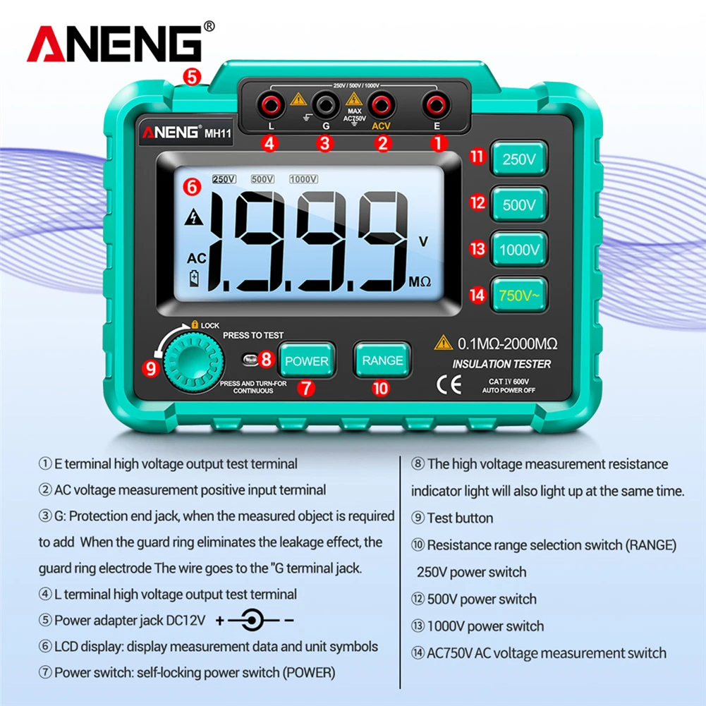 ANENG MH12 цифровой измеритель сопротивления изоляции Ом AC DC тестер напряжения ЖК-дисплей Мегаомметр Вольтметр инструментANENG MH12 цифровой измеритель сопротивления изоляции Ом AC DC тестер напряжения ЖК-дисплей Мегаомметр Вольтметр инструмент