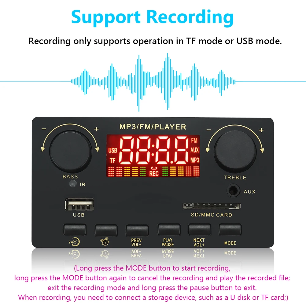 1. Функция:Совместимость с Bluetooth версии 5,0. Поддержка вызова (нажмите кнопку паузы, чтобы ответить на вызов при входящем вызове). Запись поддерживается только в режиме TF или в режиме USB. (Нажмите кнопку MODE, чтобы начать запись, удерживайте кнопку MODE снова, чтобы отменить запись и воспроизвести записанный файл; Выйти из режима записи-Нажмите кнопку паузы, чтобы выйти. При записи необходимо подключить устройство хранения данных, например u-диск или tf-карту;). Поддержка памяти отключения питания. Напряжение источника питания поддерживает 8 В-24 В постоянного тока, а ток-от 1 до 4 А. Может быть непосредственно подключен к динамикам