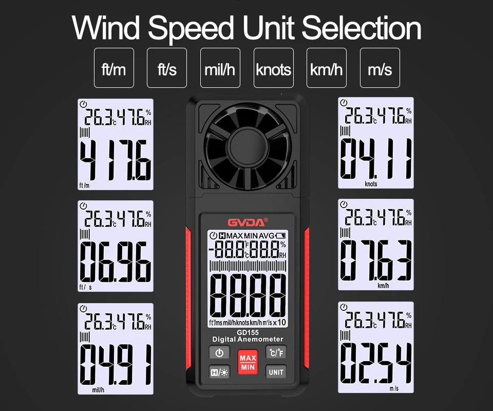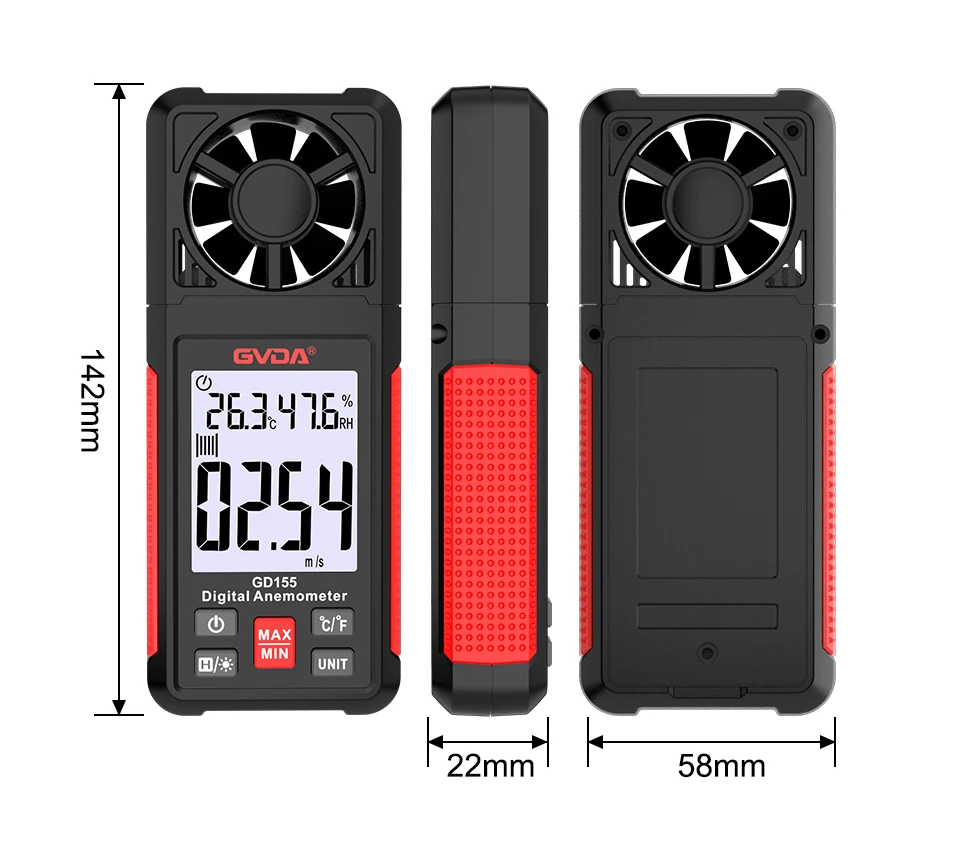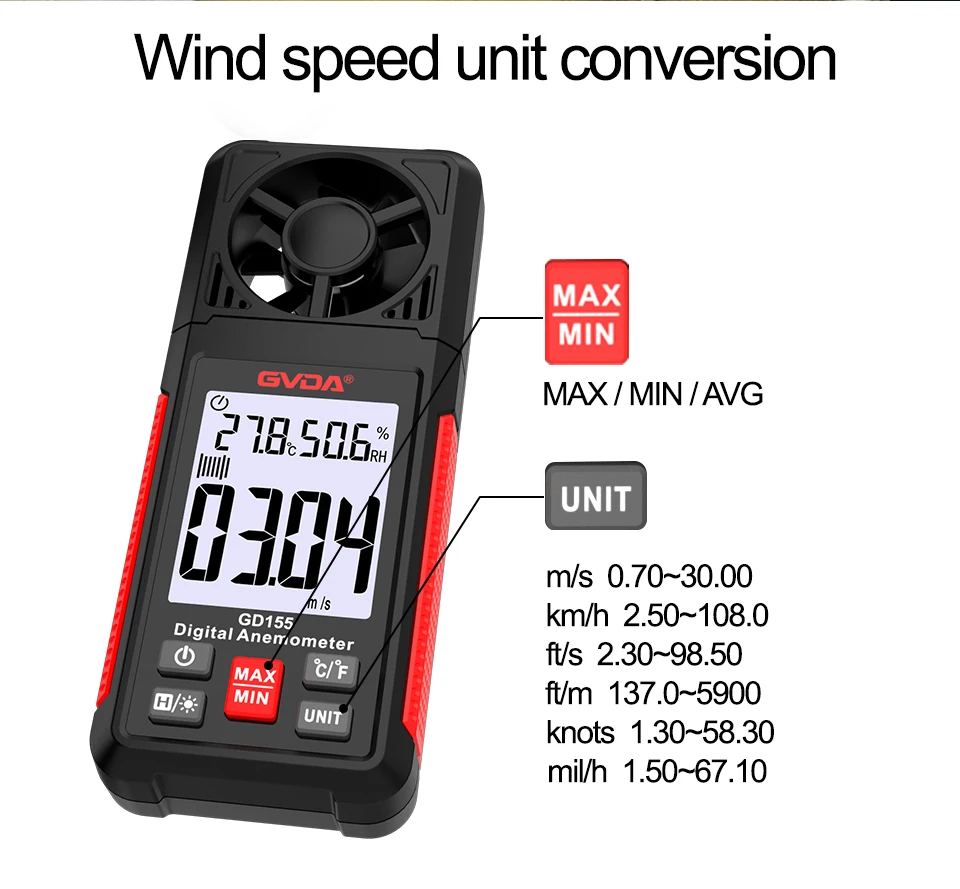 Цифровой анемометр GVDA, портативный ветромер, ветромер, ЖК-дисплей с подсветкой, измеритель температуры и влажности, датчик скорости воздуха