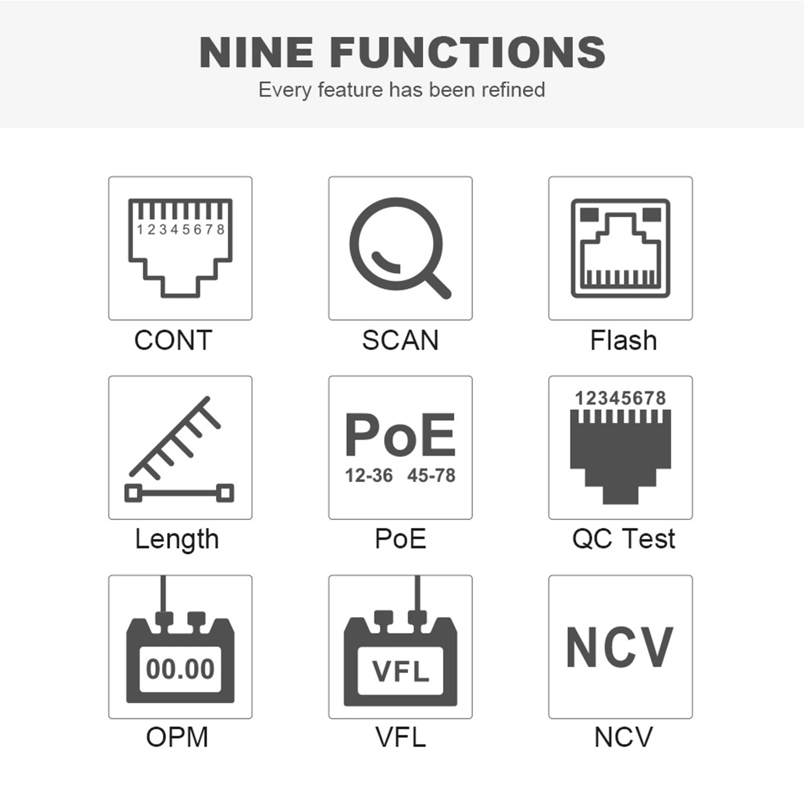 Функция проверки передатчика: в том числе проверка непрерывности кабеля, сканирование кабеля, мигание порта, измерение длины кабеля, тест PoE, проверка QC для головки кристалла, OPM (измеритель оптической мощности) И функция VFL (визуальное расположение неисправностей).