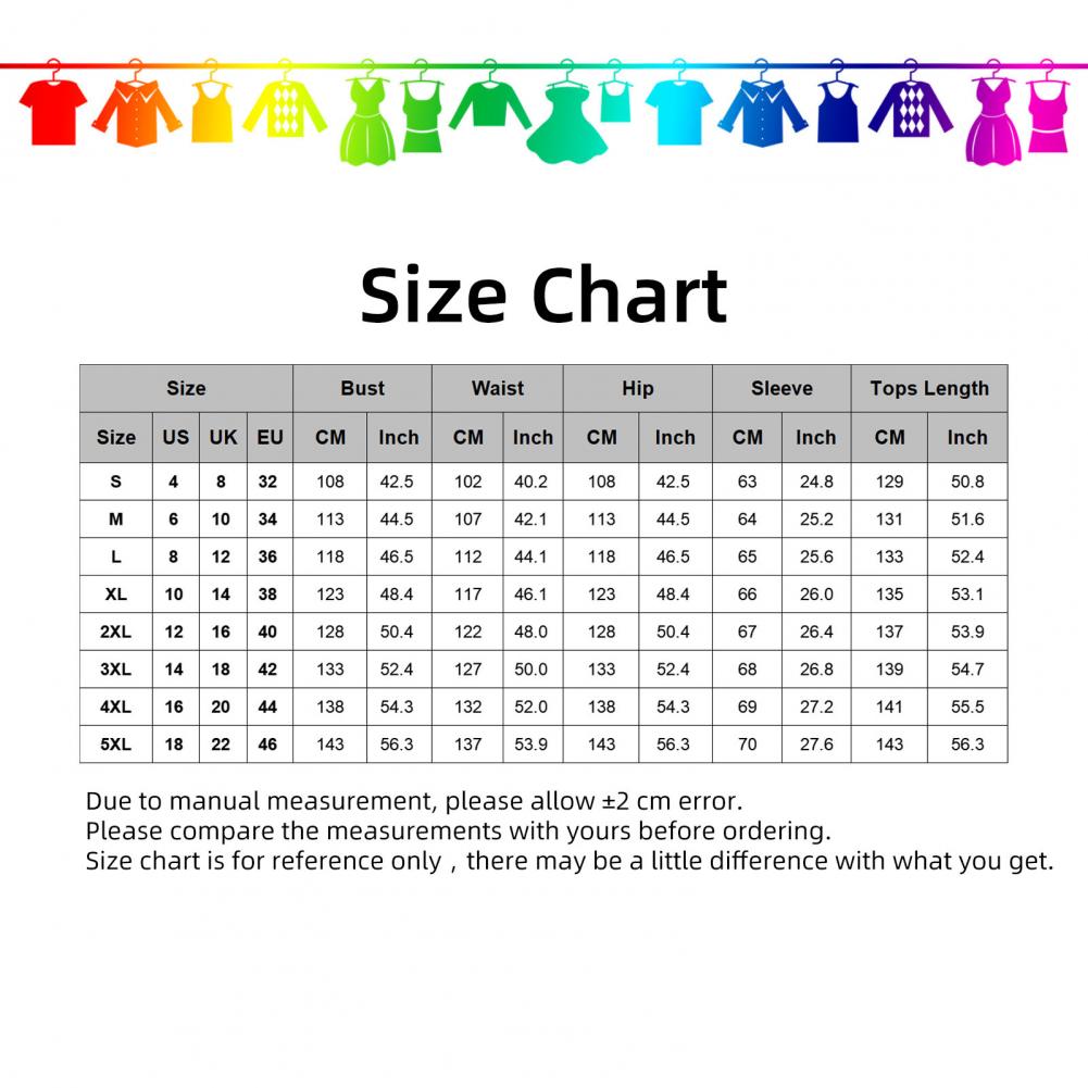 Размер: 5XL, Длина спины: 143 см/56,3 ", обхват груди: 143 см/56,3", обхват талии: 137 см/53,9 ", обхват бедер: 143 см/56,3", рукав: 70 см/27,6 "(прибл.)