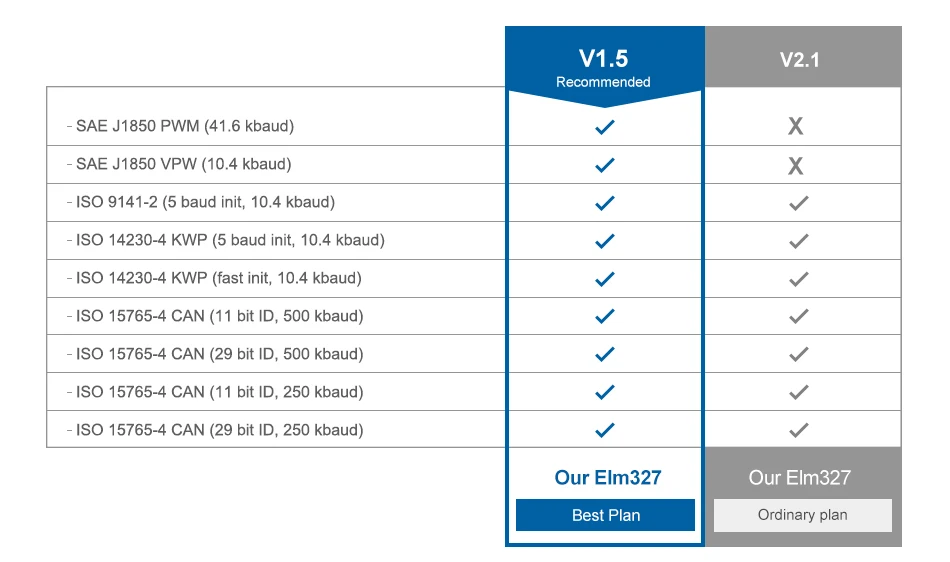 HH OBD ELM327 V1.5/V2.1 протоколы поддержки по сравнению: