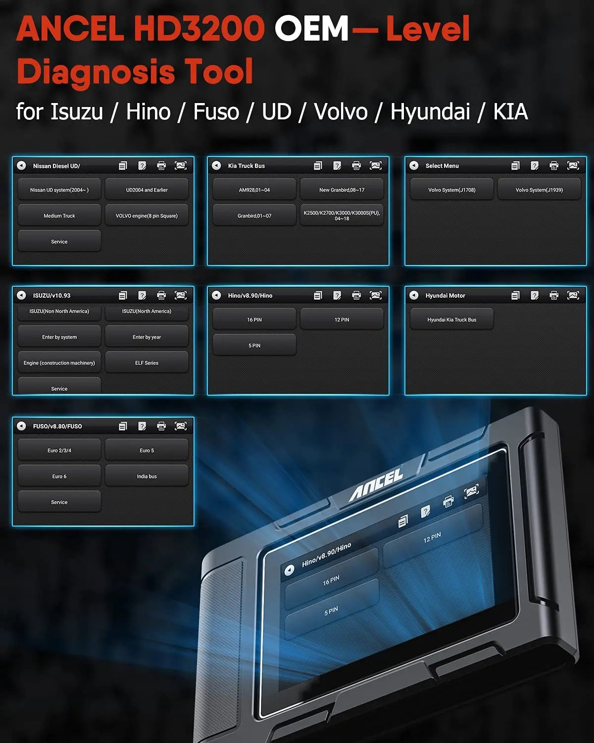 OEM уровень диагностики означает ANCEL HD3200 тяжелых грузовиков сканер может поддерживать полную систему сканирования для HINO, ISUZU, HD, VOLVO, UD, FUSO, HYUNDAI и KIA. Такие как система двигателя, система передачи, система приборной панели, корпус и система шасси, система выпечки, система ABS, Система SRS и т. д.)