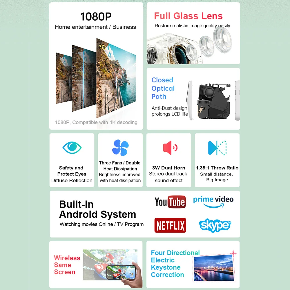 Особенности: Особенности портативного и изысканного дизайна для удовлетворения многоуровневых приложений и позволяет вам испытать большой экран аудио или видео-театра в любое время. Технология декодирования HDR10 обеспечивает более динамический диапазон и детализацию изображения для более детального и естественного изображения. 3 Вт * 2 левого и правого канальных динамика приносит вам естественный звук и всесторонний звуковой эффект 360 °. Узор из трех вентиляторов внутри и снаружи, может эффективно рассеивают тепло и продлевает срок службы светодиодный свет. По сравнению с самосветящимися изображениями диффузное отражение изображения мягче, и это не легко чувствовать усталость при наблюдении в течение длительного времени T2Max использует полностью закрытую технологию внутреннего циркуляционного рассеивания тепла, которая может полностью устранить влияние пыли на светильник и продлить срок службы.