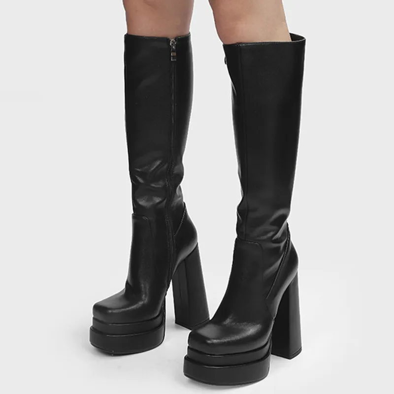 Женские ботинки на высоком каблуке; Сезон осень-зима; Обувь на платформе; Goth; Кожаные ботинки черного цвета; Дизайнерская обувь; cuissarde femme; Не сужающийся книзу массивный каблук