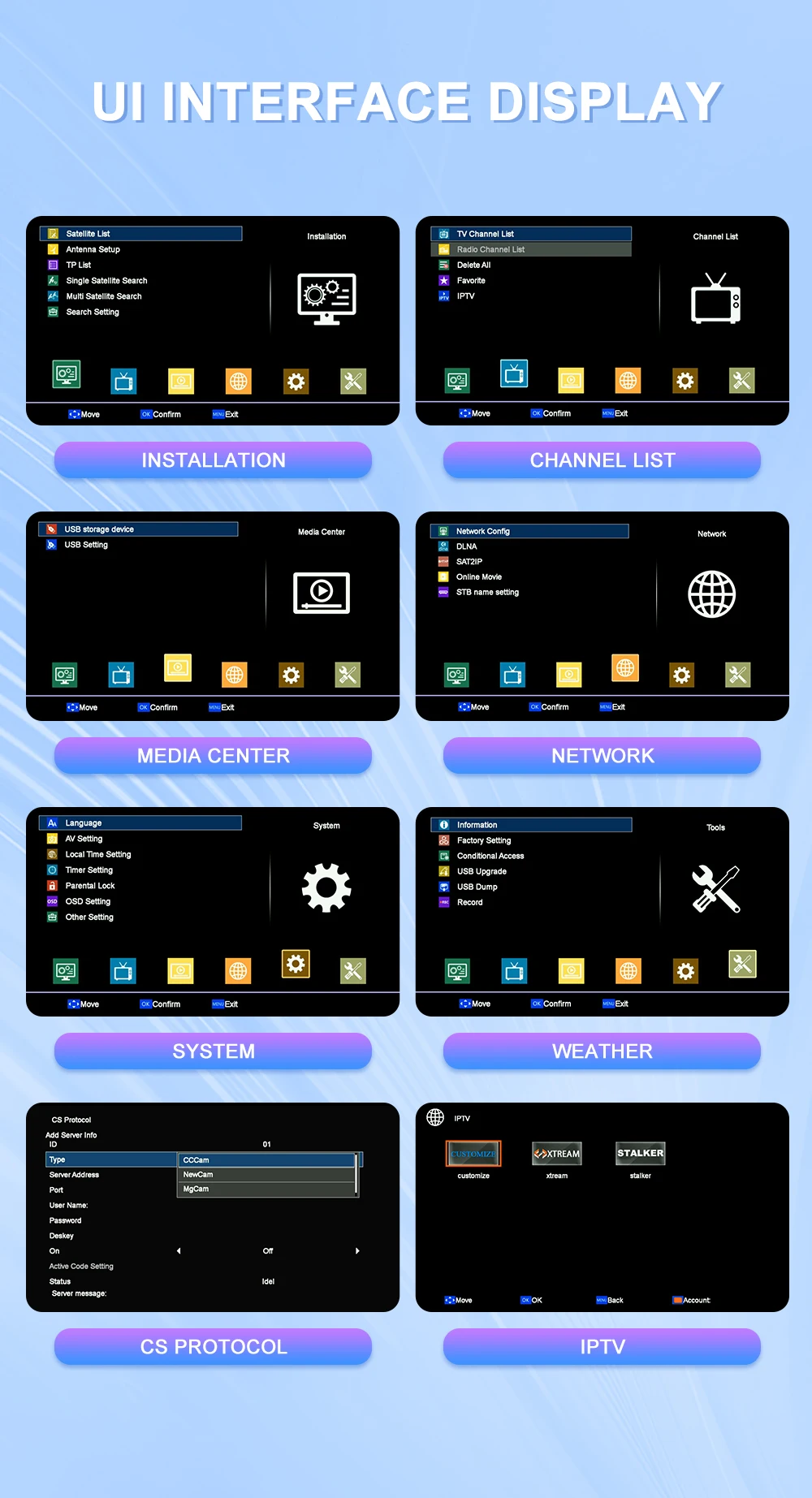 3. Поддержка Unicable, DiSEqC1.0/1,1/1,2/USALS мотор полностью поддерживает;
