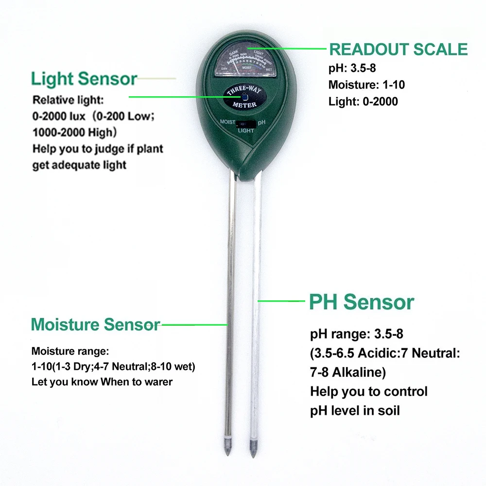 Диапазон влажности: 1-10 (1-3 сухих, 4-7 нор, 8-10 влажных); Относительный светильник: 0-2000 люкс (0-200 низких, 200-500 низких +, 500-1000 или 1000-2000 HGH); pH диапазон: 3,5-8 pH (3,5-6,5 кислота, 7, ни, 7-8 щелочи).