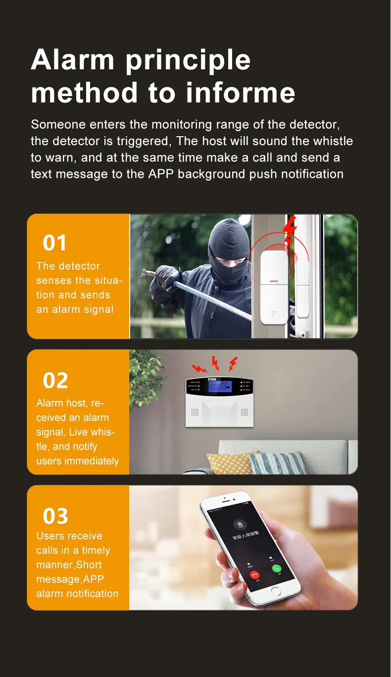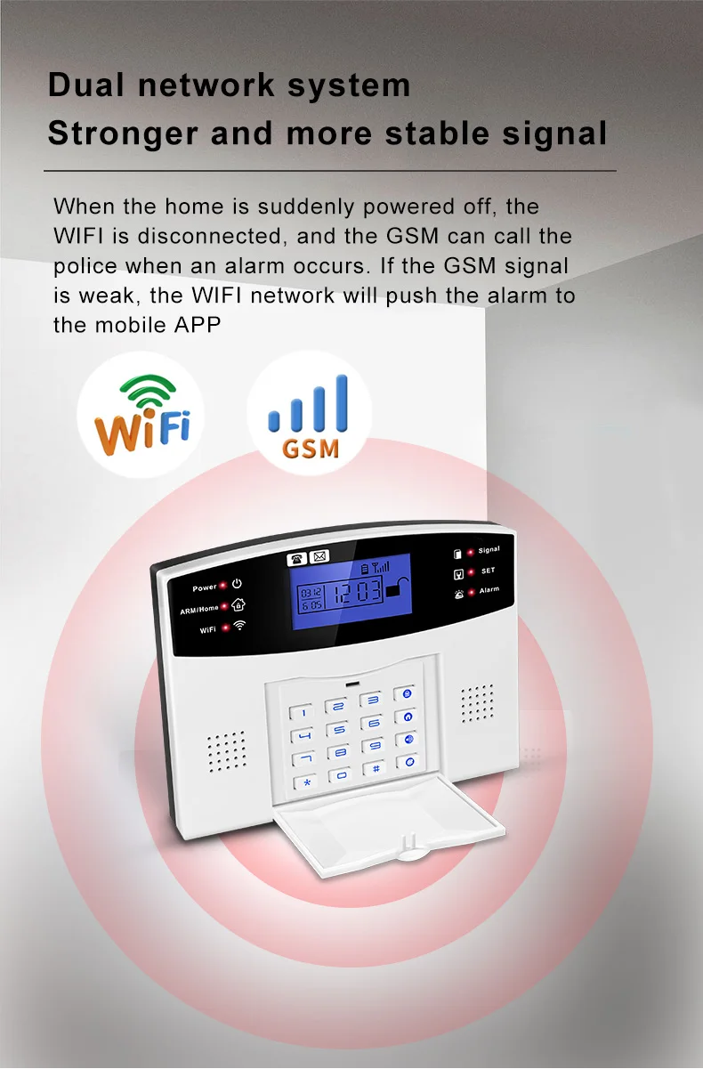 1. Если дом неожиданно выключен, Wi-Fi выключен, GSM (2g) может позвонить полиции, когда происходит сигнал тревоги.