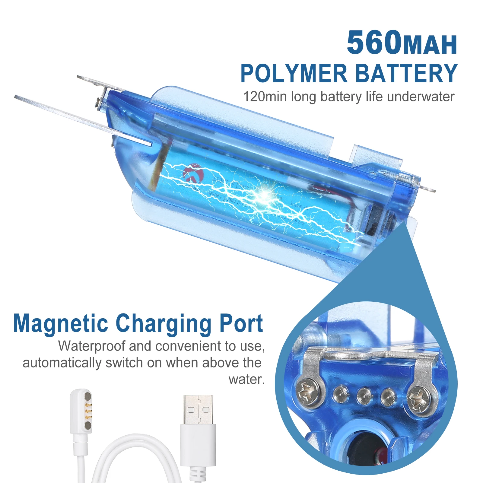 4. Встроенный полимерный аккумулятор 560 мА · ч обеспечивает до 120 мин долгий срок службы под водой.