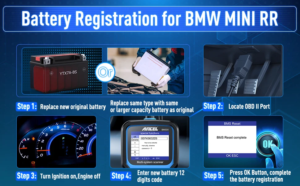 Примечание: он может зарегистрировать только новый аккумулятор с теми же характеристиками, что и оригинал. (Оценки (CCA, CA, Ah) должны быть идентичны или как можно больше оригиналу.)
