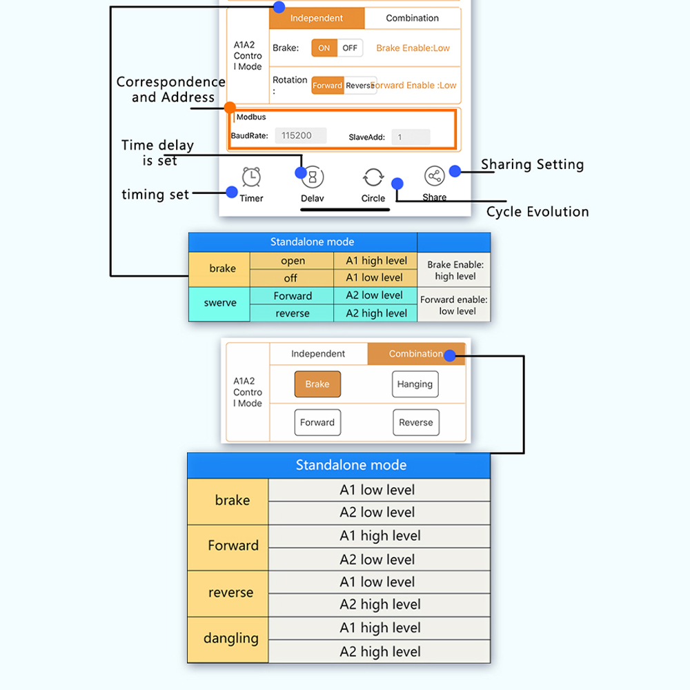 Такие функции, как вращение вперед и назад и торможение, очень масштабируются. После подключения к нашему wifi модулю, вы можете дистанционно управлять вперед и назад вращение и торможение двигателя через мобильный телефон APP.