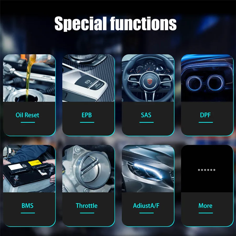 7. Профессиональное обслуживаниеИнструмент: загружен расширенными сервисными функциями, такими как сброс масла, EPB, SAS, BMS и DPF, предлагает быстрое и легкое решение повседневной задачи в мастерской;