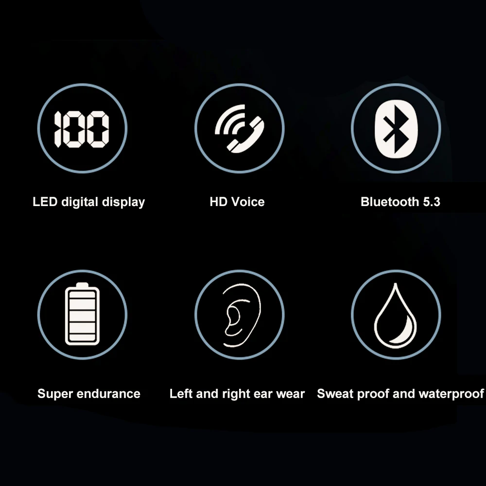 1. Ультра-длительный режим ожидания/HD голосовые уведомления о звонках/светодиодный дисплей питания/левое и правое ухо Универсальный изготовлены из водонепроницаемого материала И с защитой от пота