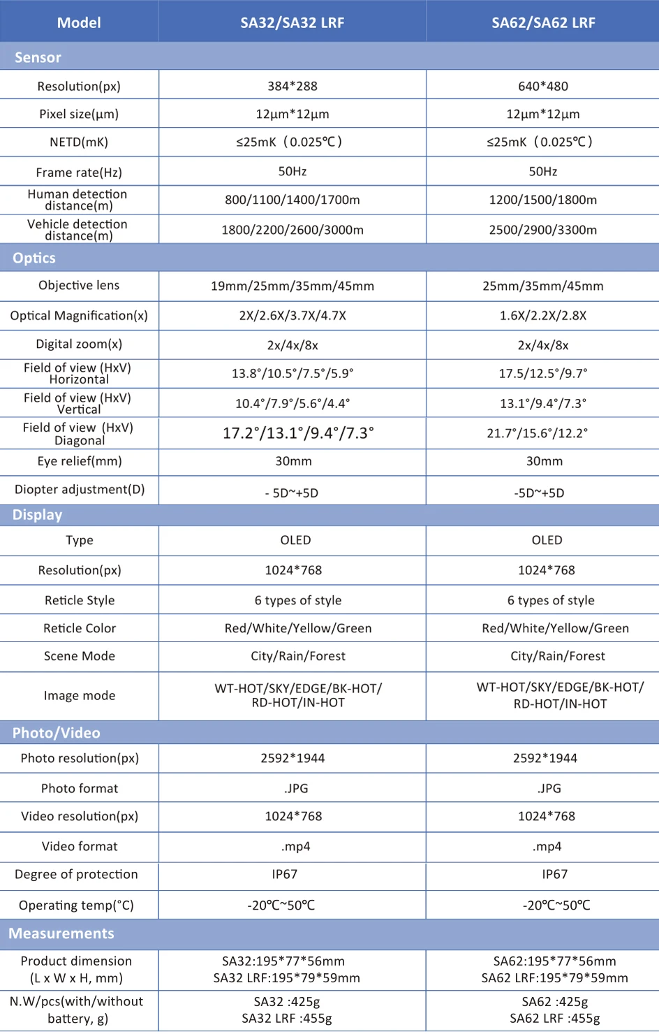 SA32/LRF-это компактное, легкое многофункциональное тепловизионное устройство. Датчик тепловизионного изображения 12um, NETD≤ 25mK может ощущать любые незначительные различия в температуре, что дает вам более высокое разрешение изображения и утонченность изображения. Устройство может использоваться в любое время в дневное или ночное время и широко используется для наблюдения за природой, охоты на открытом воздухе, разведки на открытом воздухе, безопасности и предотвращения краж, морских операций и ночного патруля.