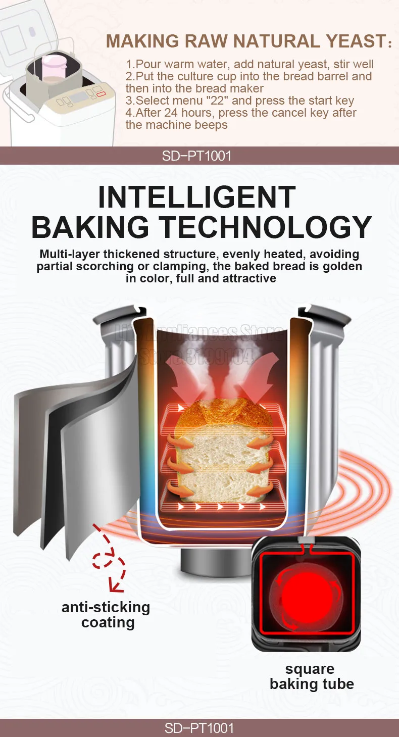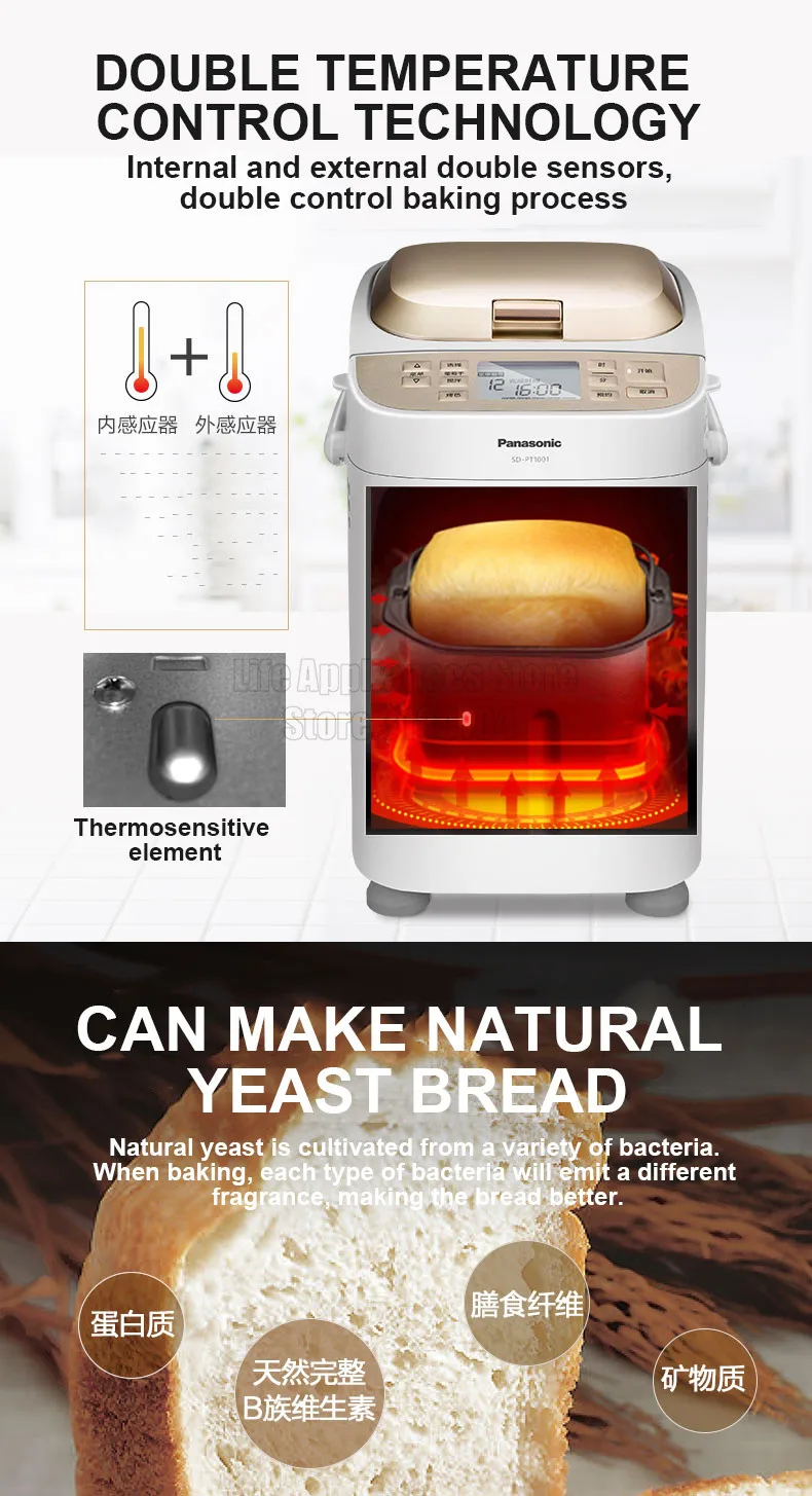 ●automatic dough kneading, automatic yeast delivery, and auxiliary ingredient delivery reminders, dual temperature detectors, to sense the temperature of the bread machine and the indoor temperature, and set the appropriate program;