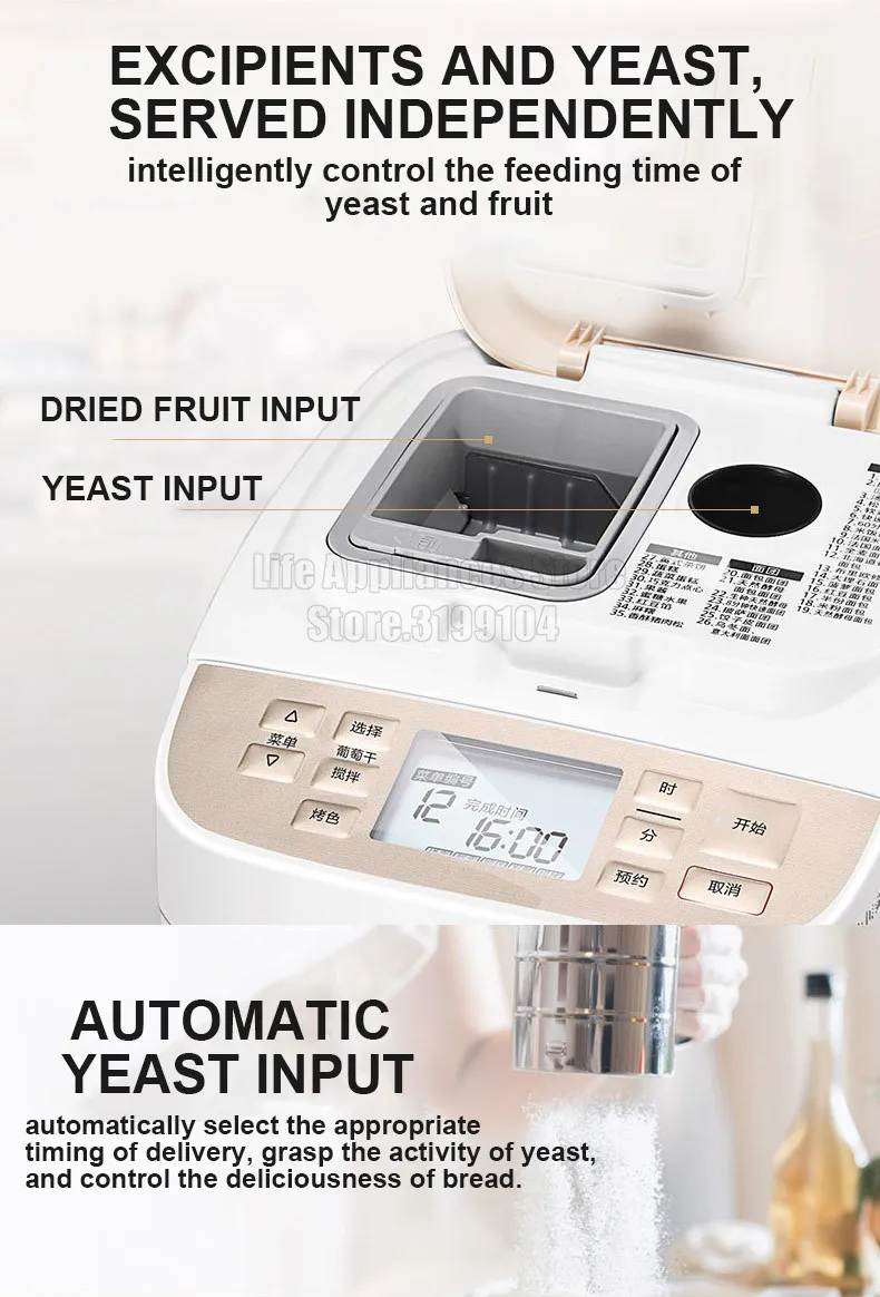 ●automatic dough kneading, automatic yeast delivery, and auxiliary ingredient delivery reminders, dual temperature detectors, to sense the temperature of the bread machine and the indoor temperature, and set the appropriate program;