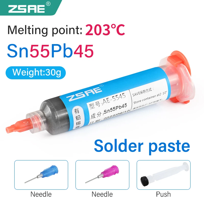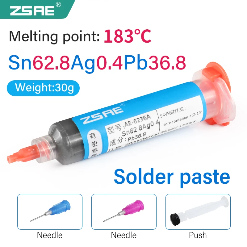 ---- AE6236A(Sn62.8Pb36.8Ag0.4): Паяльная паста средней температуры, содержащая серебро, температура плавления: 183 °C