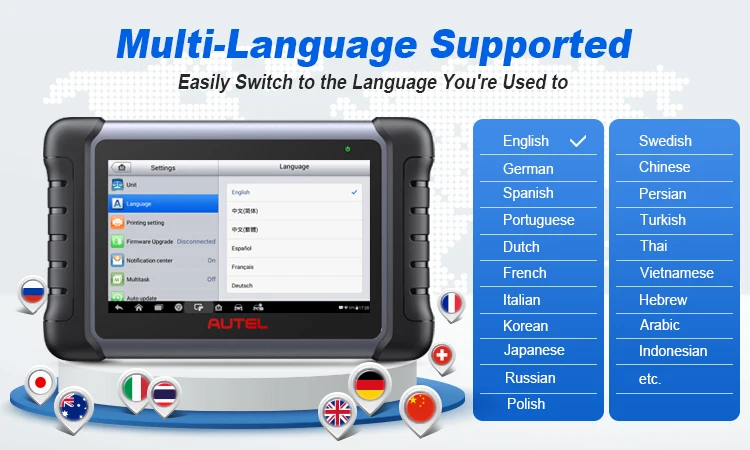 После получения продукта, пожалуйста, сообщите нам ваш SN машины для активации языка, который вам нужен. SN может быть расположен на задней части корпуса устройства или в следующем пути меню «Maxisys-> Настройки-> О нас»