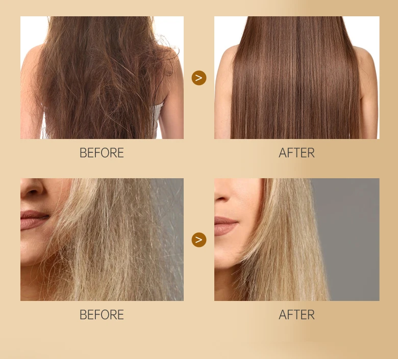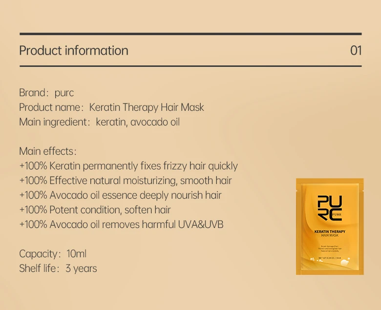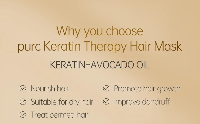 Кератин является важным компонентом для роста волос, и он высоко концентрируется в каждой грануле в кератиновой терапии Маска для волос. Во время пребывания на волосах эта маска для волос может пополнять питание, чтобы заполнить empties и трещины, вызванные внешними повреждениями, такими как сухая и Загрязненная среда, солнце подвергать или частые укладки, улучшение хрупких волос и уменьшение ломкости волос. Впитывая достаточно коллагена для роста, волосы станут крепкими и эластичными с большей блеском и меньшим секущимся концом.