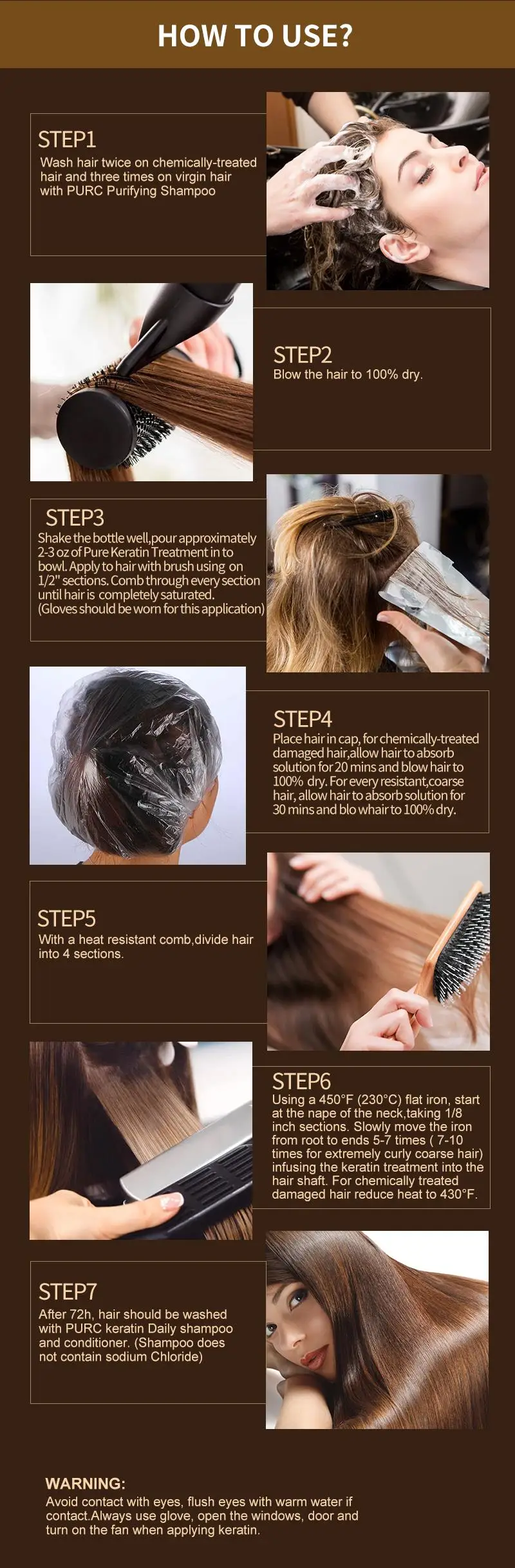 7. Используя плоский утюг 450 °F (230 °C), начните с затылка, занимая 1/8 дюйма. Медленно перемещайте железо с корня на концы 5-7 раз (7-10 раз для очень вьющихся грубых волос), заполняя Кератиновое лечение в вал волос. Для химически обработанных поврежденных волос уменьшает тепло до 430 °F.