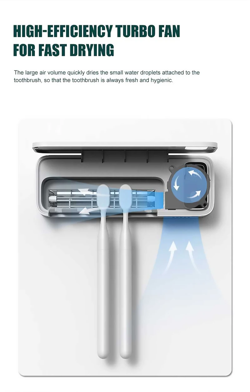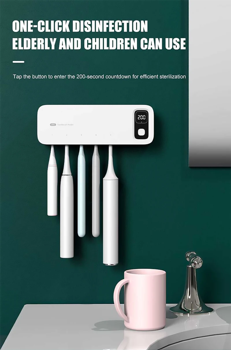 【 Многофункциональная УФ-зубная щетка дезинфицирующая 】этот УФ-держатель для зубных щеток поддерживает 5 зубных щеток, чтобы ваша столешница была аккуратной, УФ-Стерилизация держит вашу зубную щетку похожей на новую каждый день, И встроенный Турбовентилятор ускоряет высыхание вашей зубной щетки, чтобы предотвратить повторное размножение бактерий во влажной среде. Все это гарантирует, что ваша семья имеет чистые зубные щетки при чистке, это идеальный держатель зубной щетки для ванной комнаты.